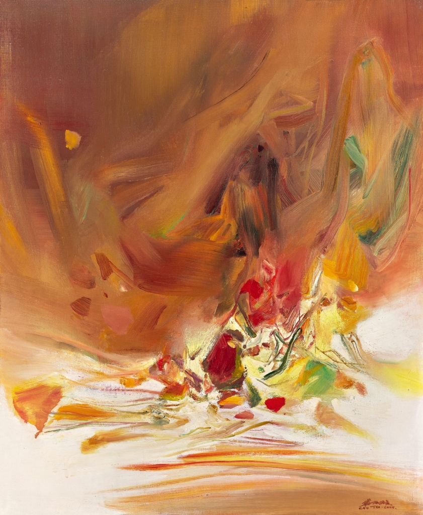 自70年代起,朱德群的創作進入了重要的突破及轉折,他在該階段提煉出畫作中的「光源」要素,將之視為色彩與線條的引導之力。而一反70年代創作多以強烈的黑白、藍彩為背景主調,此件《構圖第541號》獨闢蹊徑,全幅運用溫暖奪目的橙黃、磚紅色,鋪染大片的暖色光影,呈現鳴放馳騁的宏亮視覺感,如見蘇東坡之詩「一年好景君須記,最是橙黃橘綠時」中,那生機勃勃、果實累累的秋日盛景。而他大膽以鮮妍的朱紅、墨綠的對比色並置中心,如將火的熾熱、土的雄渾、風的飄浮、水的流汩,融為一體,組構出令人難忘的視覺感受。除外,他更將東方直立山水的氣象佈局,切入抽象形態的表達,底端的留白處理,形成下空上滿的空間對比,高低起伏的連動筆刷如見連綿山巒,細膩平滑的游絲線條則化為錚琮流水,令自然的韻律低迴繚繞於斑斑色彩間,演繹著令人耳目一新的生命之境。