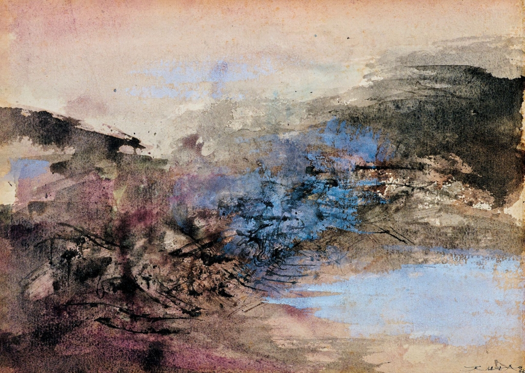 1959年,趙無極以其滿懷激情、無畏和能量的「狂草時期」創作,開啟了下一個藝術十年的全盛巔峰。他跨步立足於東方傳統山水與西方現代抽象這兩處源流之上,除了從東方書法中提煉出蒼勁的筆勢外,並以自然山水為想像依託,透過色彩、構圖的和諧統領,釋放抽象的強勁表現力,在60年代作出深具突破性的藝術成就。完成於1967年的《靜峽清潭》充分展現趙無極此時期的創作旨趣,畫中如見千岩萬壑、狂瀑激湍、煙雲蒸騰、風聲颯颯等種種抽象形態,擴展而現蘊藏的自然至境,為其水彩創作中細節豐富、飽含詩意的精煉之作。《靜峽清潭》以中央密實、上下疏空的布構,於方寸間現天地恢弘,高度展現趙無極狂草時期最為經典的「中軸式」構圖。澎湃的墨筆自右端橫空發力,如滔天巨浪呼嘯而至,風卷雲騰隨之湧動,並自中心向左昂揚迴旋,掀動層層波瀾,滌蕩著匯入無際大地。畫境「致廣大而盡精微」,在畫幅中央,綿密剛勁的狂草線條以靈動、綿密、多向的震顫筆觸迸放盤旋,作出深具結構性的鋪展。交錯的碎筆形形互適,似浪花陣陣,又如山石嶙峋,建立著強烈的筆墨之質。