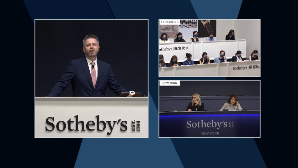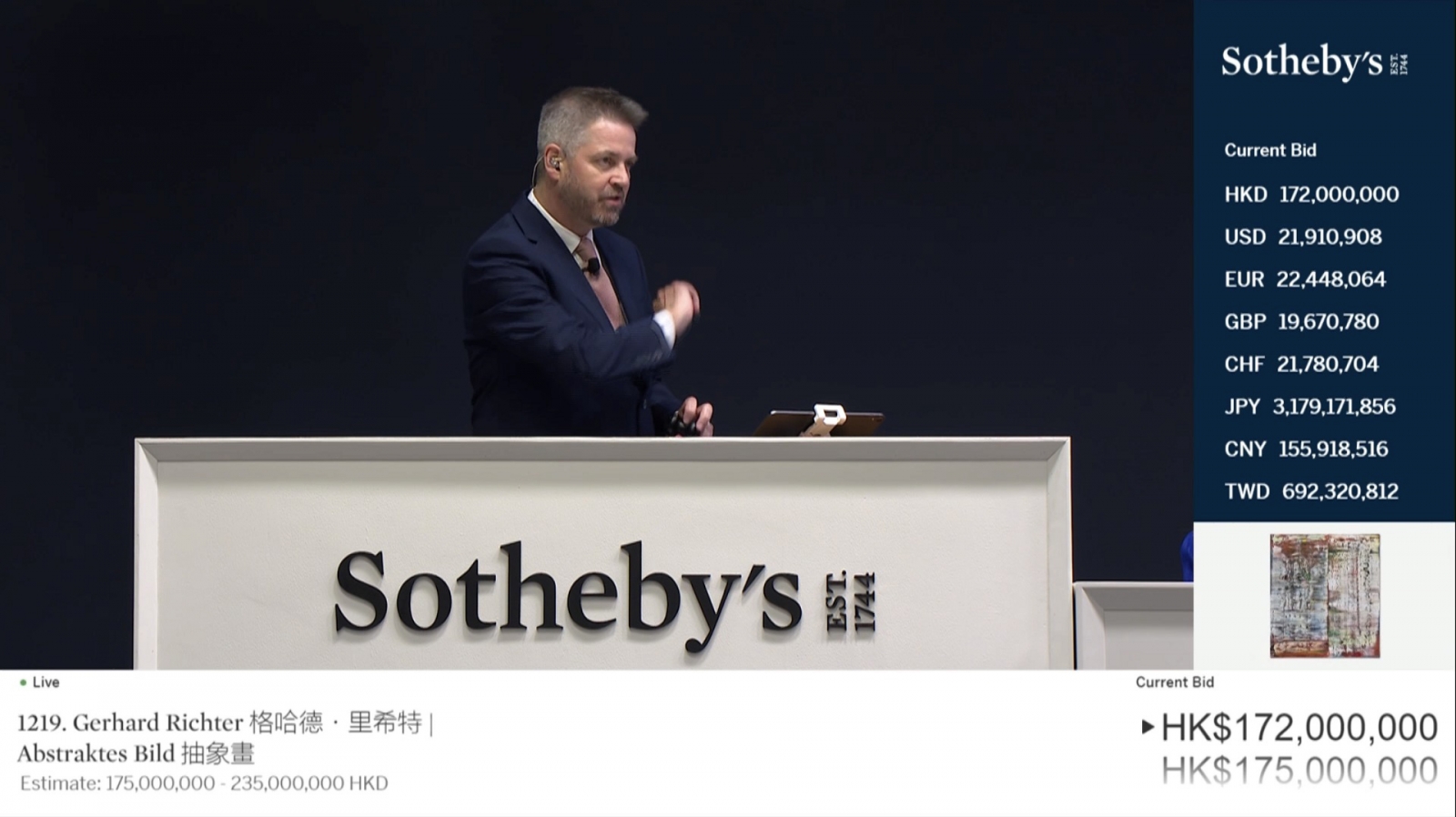 香港蘇富比舉辦的當代藝術與當代藝術晚間拍賣,也與紐約專家連線競投。(擷取自蘇富比官網直播畫面)