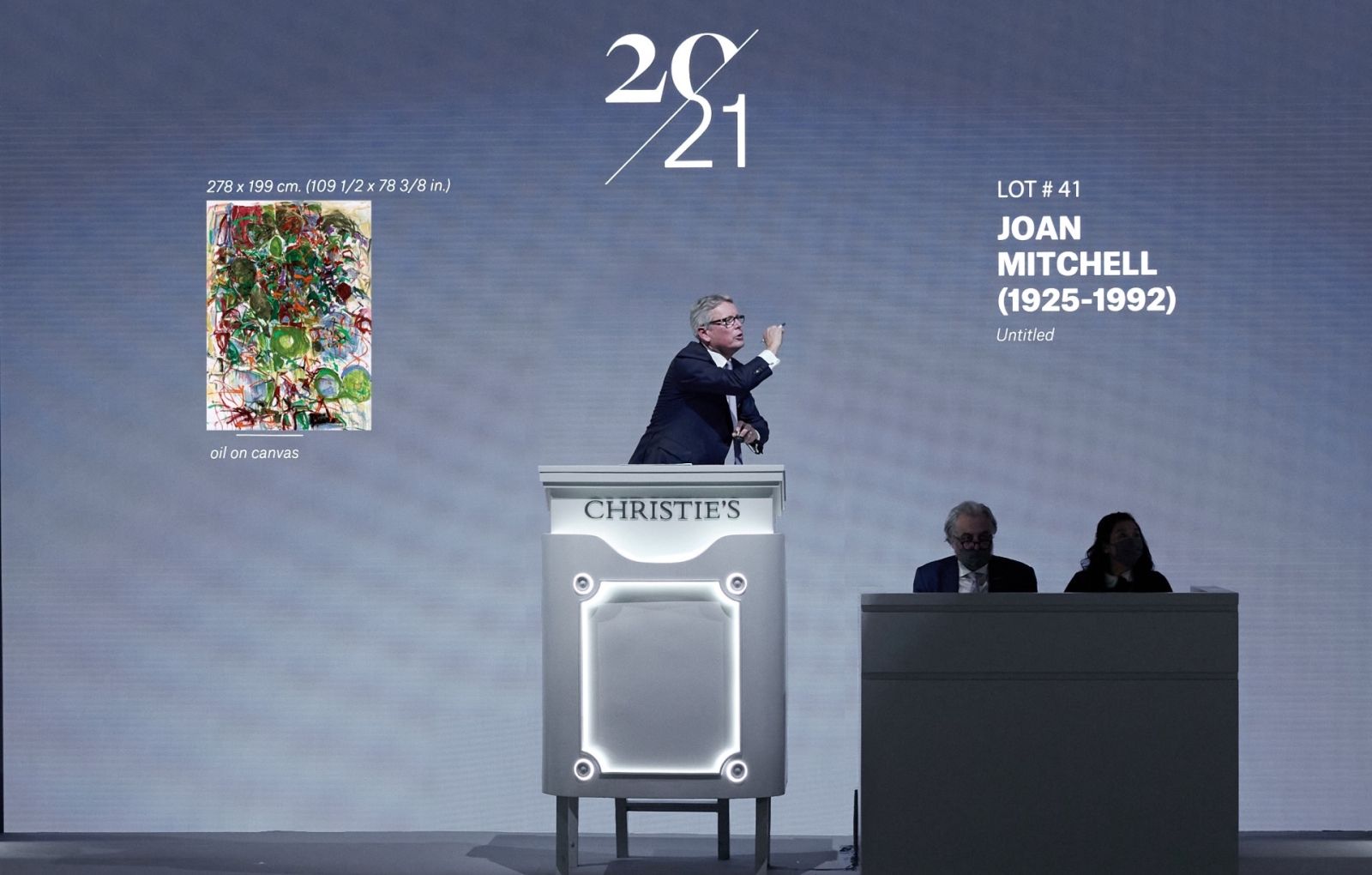 率先舉槌的「二十及二十一世紀藝術」晚間拍賣,共有51件作品上拍、43件成交,成交率為84%,成交總額為6億7,821萬港元。本季領銜拍品為首度在亞洲拍場登台的抽象表現主義藝術家瓊.米切爾(Joan Mitchell)的《無題》,此件創作於1966至1967年,迥異於同時期常見的「黑畫」風格,以疾速奔放的筆觸、豐富層疊的用色轉化其記憶中的風景。拍前估價為8,000萬至1億2,000萬港元,自5,000萬港元起拍,最終以8,335萬港元成交,也一舉躍居此場晚拍冠軍之作。而拍賣預展時宣傳的焦點作品——常玉的《梅花盆景》則在拍前宣布撤拍。