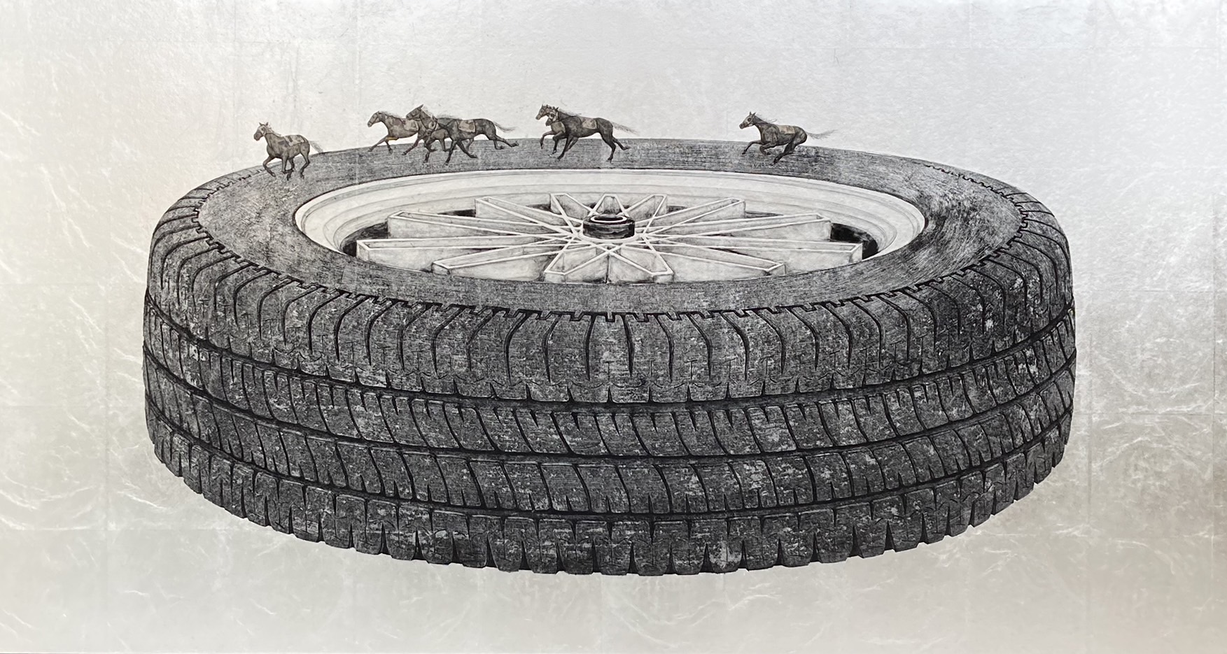 延伸自去年發表的《黑白》系列,白田誉主也的新作將動物行為與生活中熟悉的人工製品相結合,回應社會狀態對動物處境的影響。如2023年新作〈Derby〉,看著在輪胎上奔馳的賽馬群,畫面中自帶荒謬與無奈之感,畢竟無論賽馬跑得再快,在科技產物的面前終究是敗者。馬也從人類不可或缺的農耕運輸夥伴,轉型為象徵娛樂文化的動物。在人類日益重視動物倫理的今日,藝術家藉由畫作引領觀者反思人類與自然萬物的共生關係。