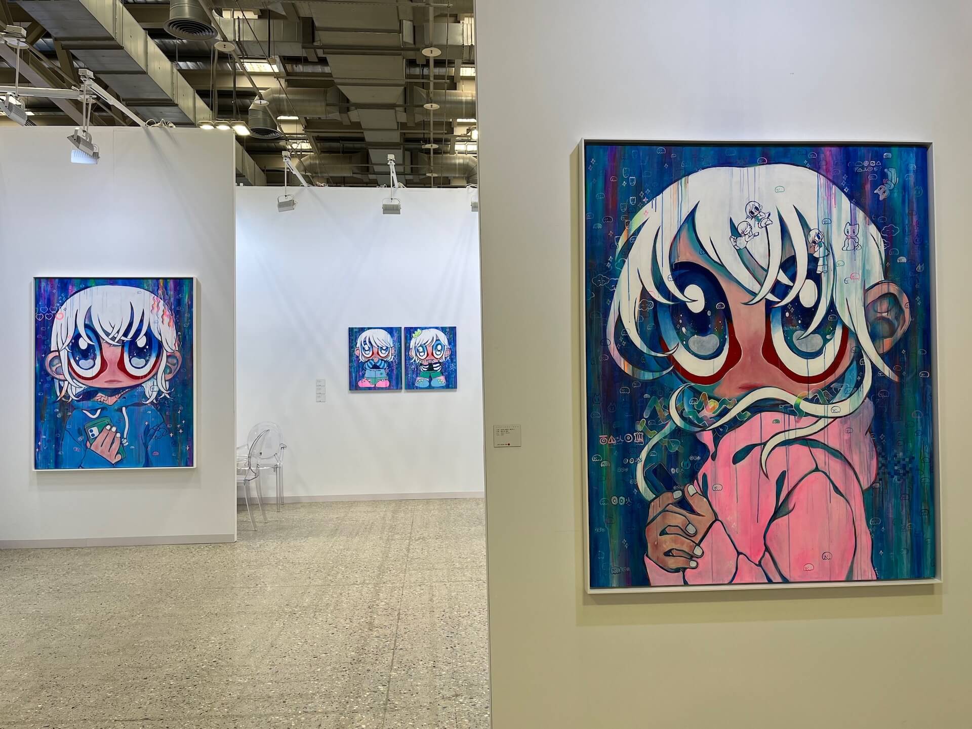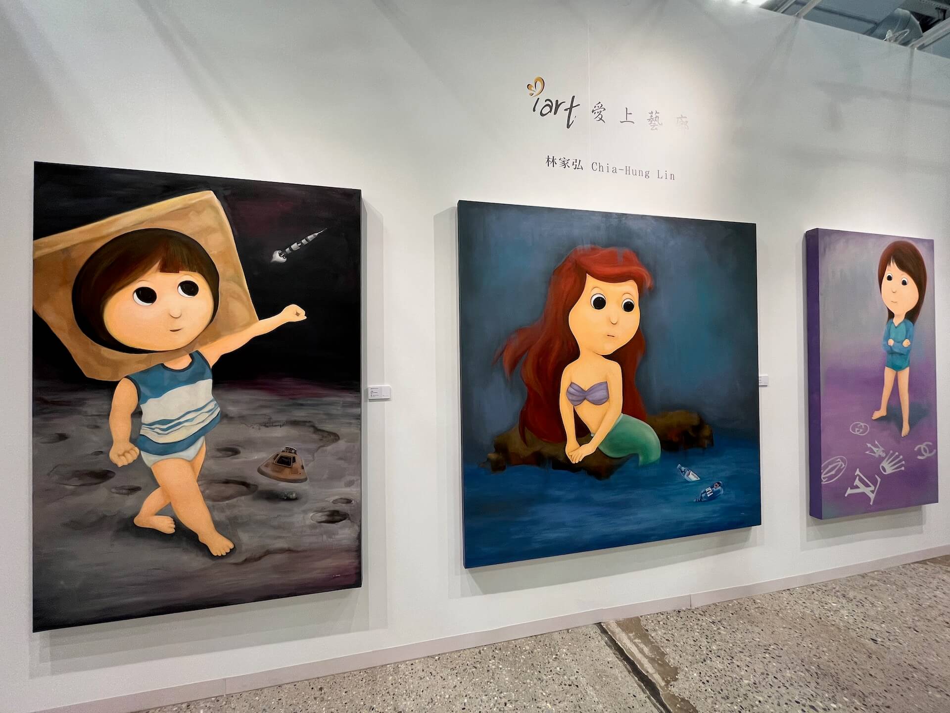 深耕新竹在地多年的愛上藝廊,於今年首度參加藝術博覽會,即帶來獨家代理的藝術家林家弘個展。此次展出作品創作於疫情肆虐全球之際,當時正在海外創作的林家弘,以異地生活所感及見聞為發想,用簡明的符號、物件破題,引領觀者進入作品之中,共享疫情當下的心境體悟。另一方面,疫情亦加速了人類科技的發展進程,於是藝術家開啟「元宇宙」創作題材,將對於未來科技的想像帶入作品,結合其最為人熟知的「大眼女孩」創作標誌,描繪日漸模糊難辨的真實與虛擬世界。