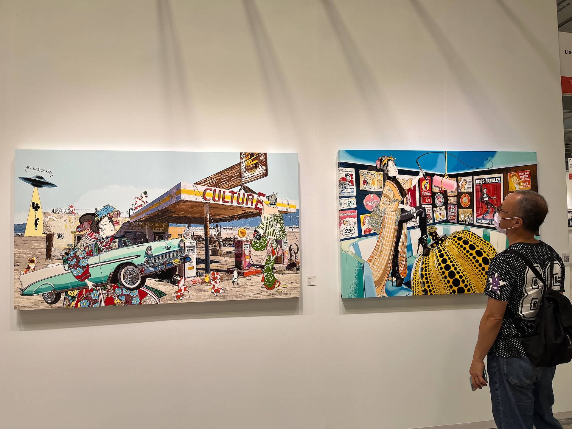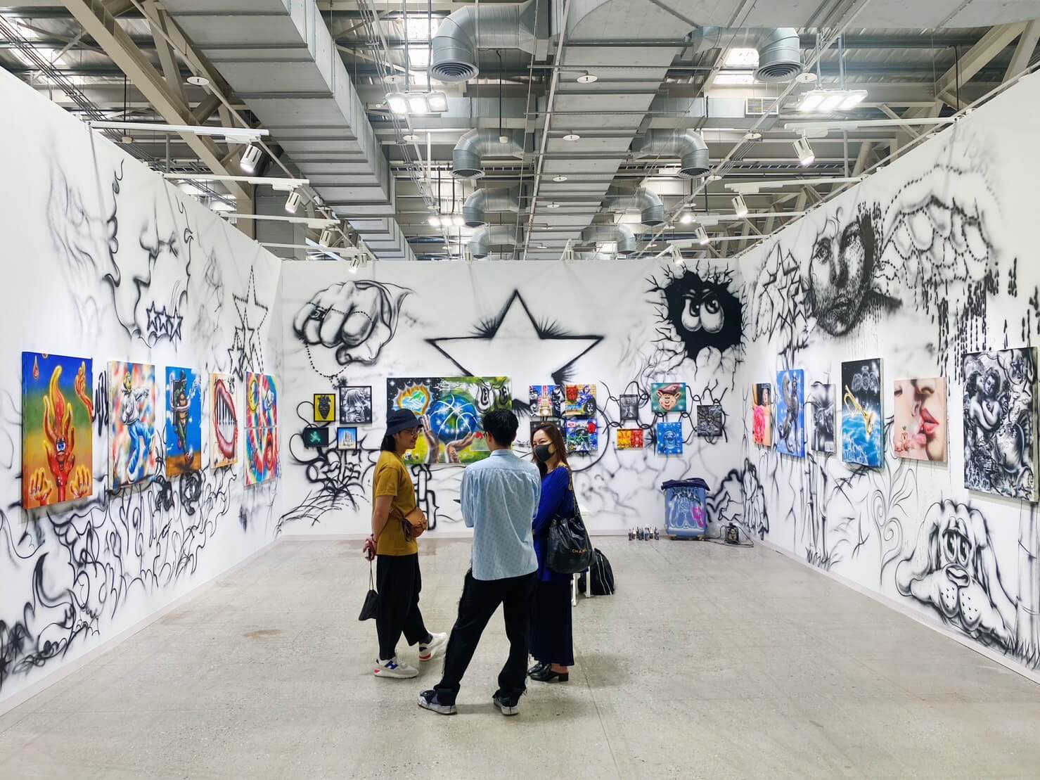 在繪畫技法上,不難看出Daimon對於噴漆力道的熟稔拿捏,呼應街頭塗鴉線條裡的霧面感。而在視覺元素中,卻又不拘泥於在藝博會展位中常見的迪士尼、寶可夢或知名的卡通與漫畫人物,反倒有許多的卡通形象,更能令人聯想到日本美式街頭文化或古著文化裡的圖像。