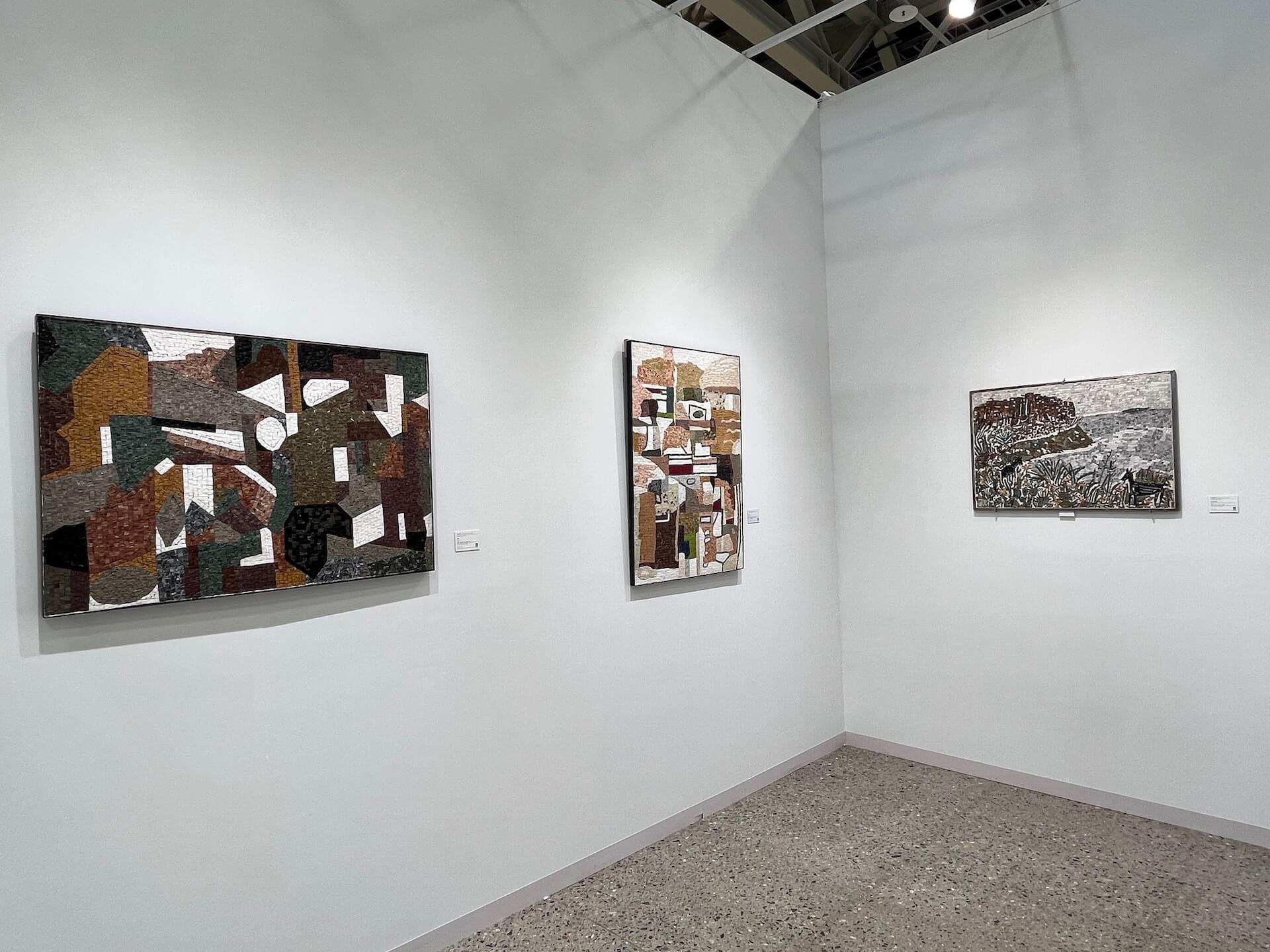 第二年參展的尊彩藝術中心,呈現江凱群與帆偉兩位藝術家個展。甫於2022年完成北美館個展的江凱群,除了帶來使用大理石、蛇紋岩、石灰岩等台灣在地石材創作,細膩拼貼植物花卉、自然地景,反映當代共同生活經驗之作,也展出全新幾何系列作品。在天然石材理性、嚴謹的切割線條中,拼貼出更大面積、具躍動感的幾何色塊,試圖以經典馬賽克美學融合當代藝術視野,與觀者對話。