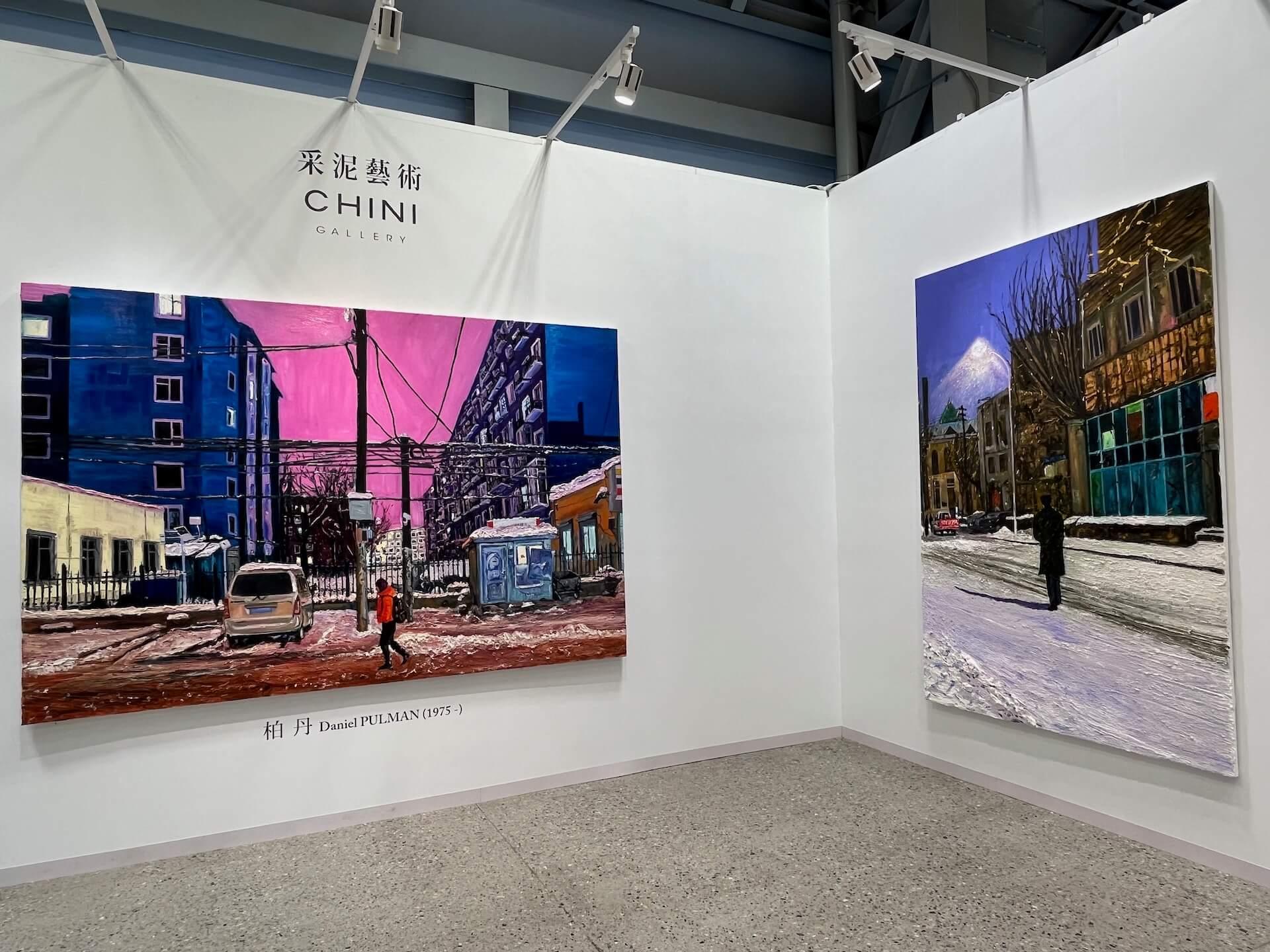 「夜之畫」系列誕生自2020年冬季柏丹走訪世界各地城市旅行的親身經歷,充滿工業感的都市景觀自然地成為畫中的背景。藝術家用顏料層疊出被白雪覆蓋的厚實路面,再以刮板刮出積雪的質地紋理。分不清是月亮還是高樓大廈、街燈點亮了夜色,但視野所及之處,只見踽踽獨行之人,那孤寂的身影似乎也沾染了藝術家心中的不安與恐懼。