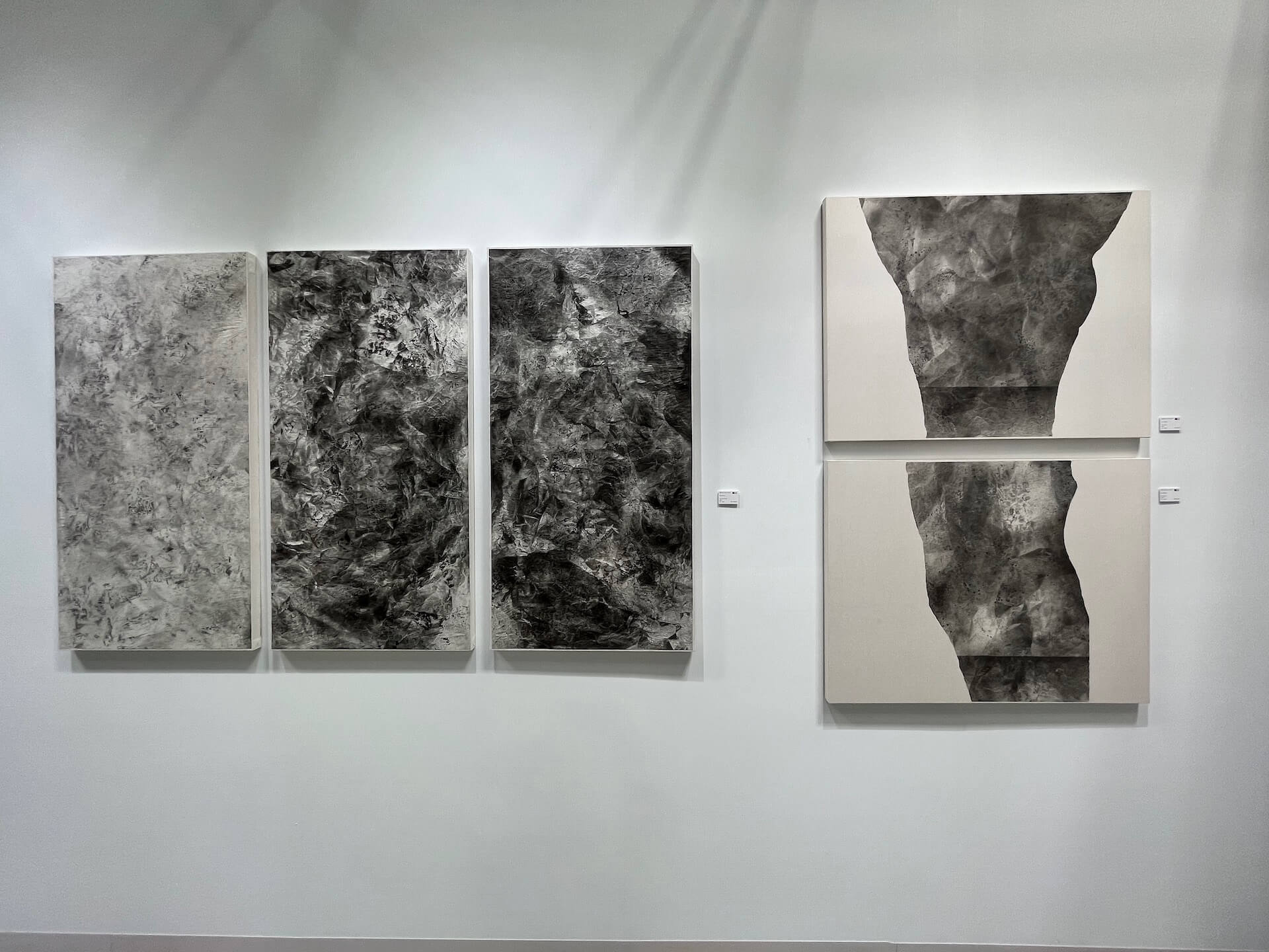 著重表達物質性及討論真實的藝術家蕭宇倢,運用揉捏、皺摺、噴灑等方式,以低限度的水墨繪畫建構畫面,並在畫面操作上保留想像空間,以單純的結構減去可與現實參照的形象,誘使觀者進一步思考創作媒材的本質,從中尋找新的詮釋可能。本次展出的作品中,可以見到藝術家嘗試賦予宣紙新意,以墨色的灰階層疊出畫面,搭配折疊過後產生些微立體感的紙張,更直接地發揮媒材的物質性,凸顯宣紙這項材質所散發的詩意。在視覺美感的追尋外,創造出繪畫語言之外的表現。