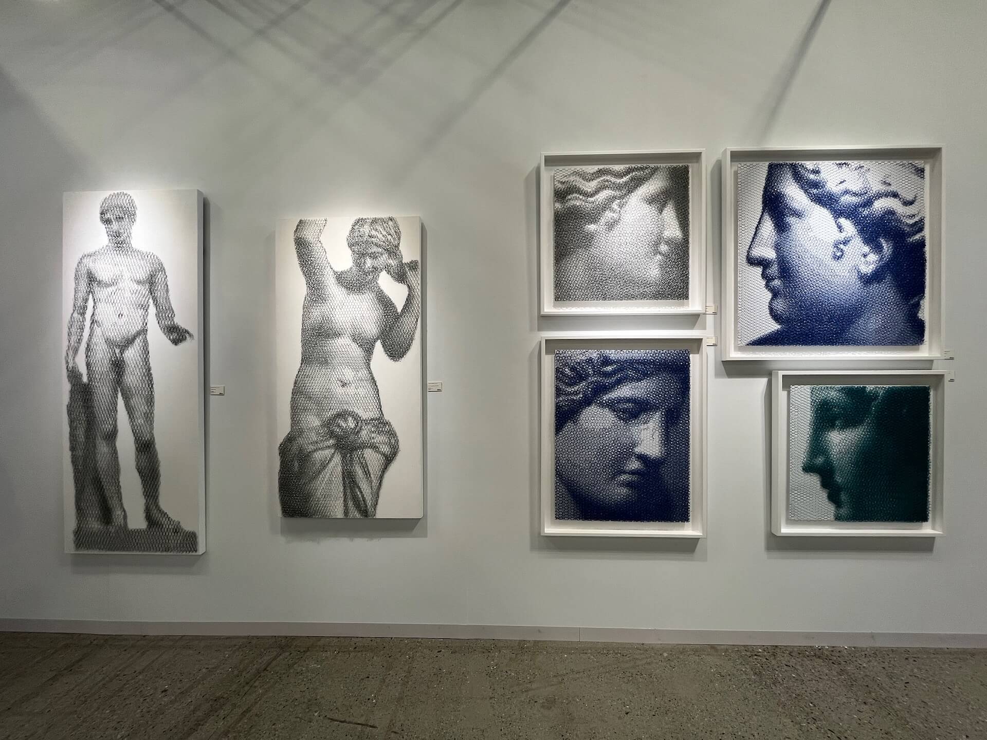 具有專業攝影背景的Giorgio Tentolini喬治,擅長拆解分析圖像的光影對比。他的經典系列以手工切割的鐵絲網為創作媒材,重新演繹古典雕塑、建築等主題。在單色背景上,帶有六邊形網眼的鐵絲網經過切割、層層交織後,形成疏密不一的構圖。近看時就像模糊不清的低像素攝影作品,但將觀賞距離拉遠,搭配現場燈光照射後,作品全貌才會漸漸顯現出來。
