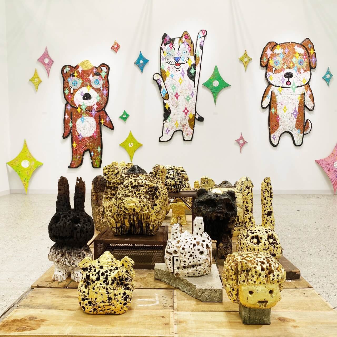 若佐慎一的創作命題一直關注著繪畫與雕塑的交叉性。他自認為受到日本平安時代的大和繪啟發,並以此將日本神道信仰中的象徵,與當代動畫與電玩結合,藝術家並不將創作化為可愛的物,而是從中探索交叉性裡的破壞與創造。他的招財貓系列作品也曾在日本著名的招財貓神社「豪德社」展出過,而新作則是延續其與傢俱品牌「Karimoku Furniture」以及日本著名的媒體藝術家落合陽一的合作作品,進一步轉化傢俱廢料的雕塑新作,以粗猛的雕塑狀態回應日本的物神信仰在當代消費主義社會中的境遇。