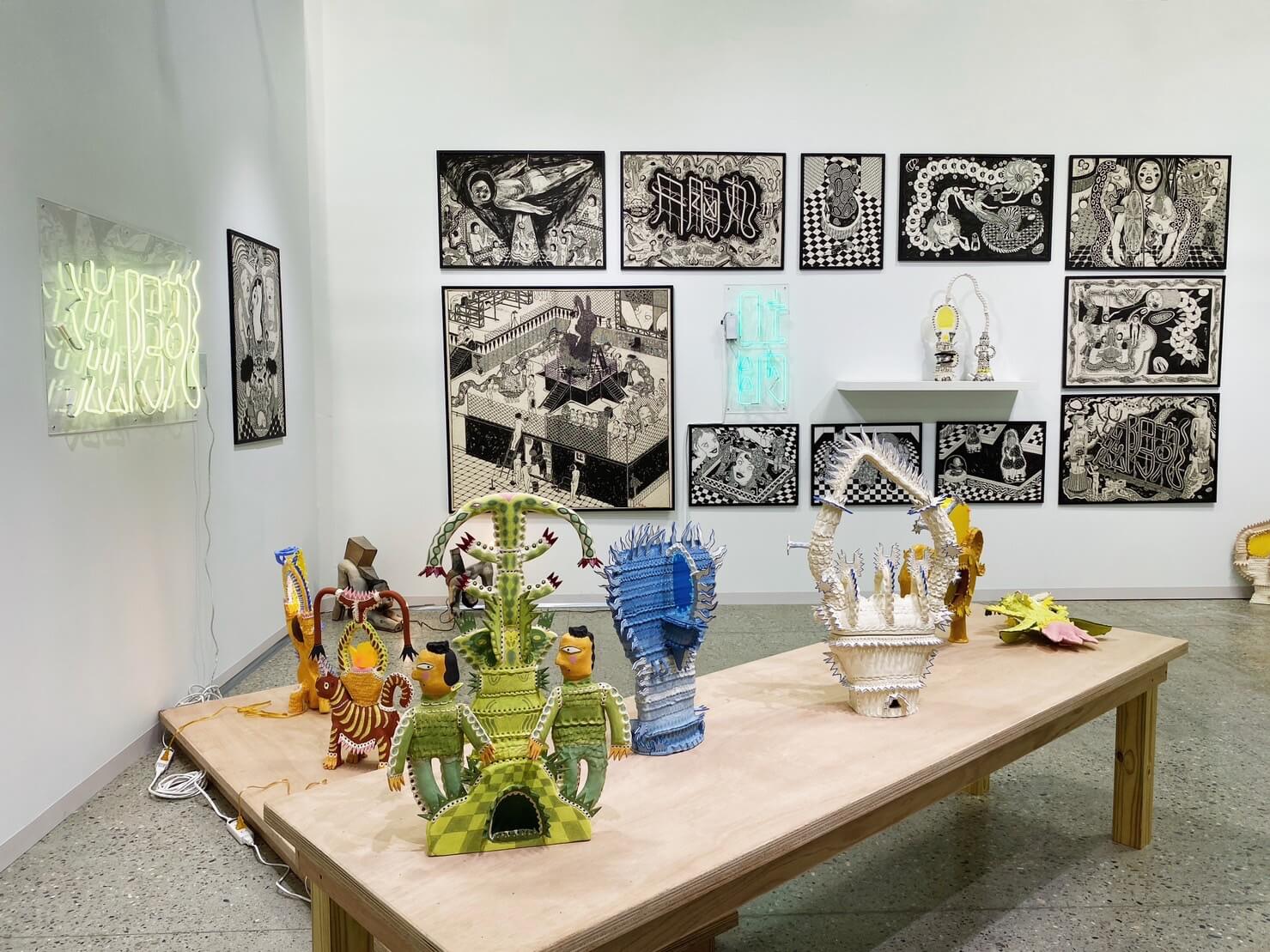 而侯辰璐除了帶來過往著名的黑白繪畫與霓虹燈裝置作品之外,以麵花剪粘為造型創作發想的複合媒材立體新作,將華人民俗美術中的紋樣,融合其在繪畫中時常表露出的怪誕感。在作品中反映著立體而非樣板的亞洲性,亦令人眼睛為之一亮。畫廊透露,藝術家也已計劃於畫廊空間舉辦大型個展。