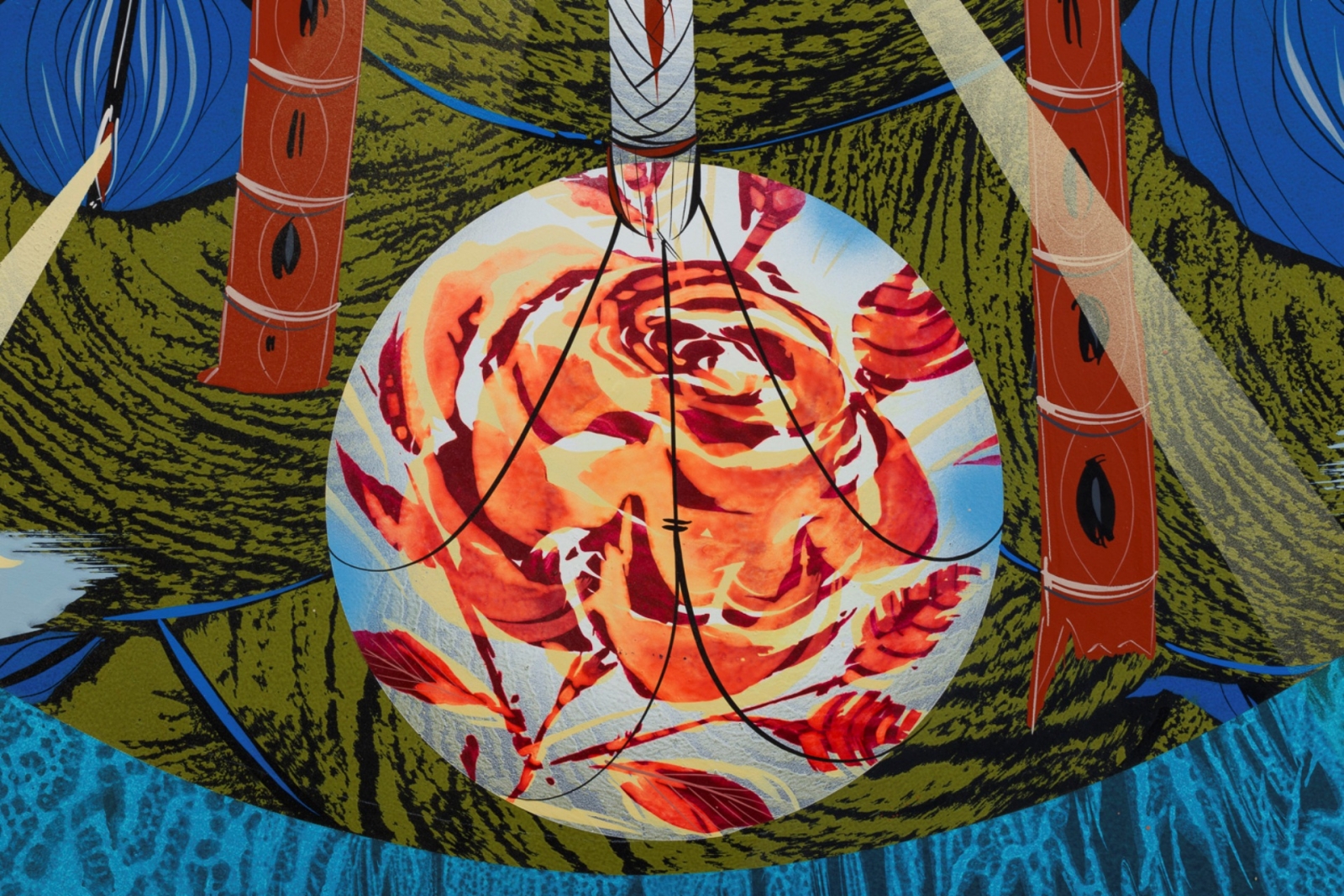 皮特曼對於深遠的空間場景之經營有其特殊的觀點與闡釋,他運用鮮明的色彩、細緻且富有寓意的元素與超現實的意象,以繁複的建築與裝飾藝術堆疊出奇幻的城市景觀,呈現出都會生活的生機。而「蛋」作為皮特曼作品當中經常出現的符號,其圓潤潔白的形象往往被他描繪得有如路燈的光源,或為紀念碑的指涉,而昇華至帶有崇高感的意味。在本屆台北當代展出創作於2013年的《無題 #1》即典型地反映藝術家長年對象徵主義和圖像學傳統的複雜性之探索,在此作同樣以重複出現的蛋形圖像為視覺焦點中心,暗示著生命起源和創造的可能性,而穿插其中的玫瑰與羽毛亦具有再生與繁殖的象徵,至於他所挪用的部落戰斧之意象也暗指美國殖民史的過往,透過繽紛元素的舖疊為爬梳人類文明的發展歷程另闢蹊徑。