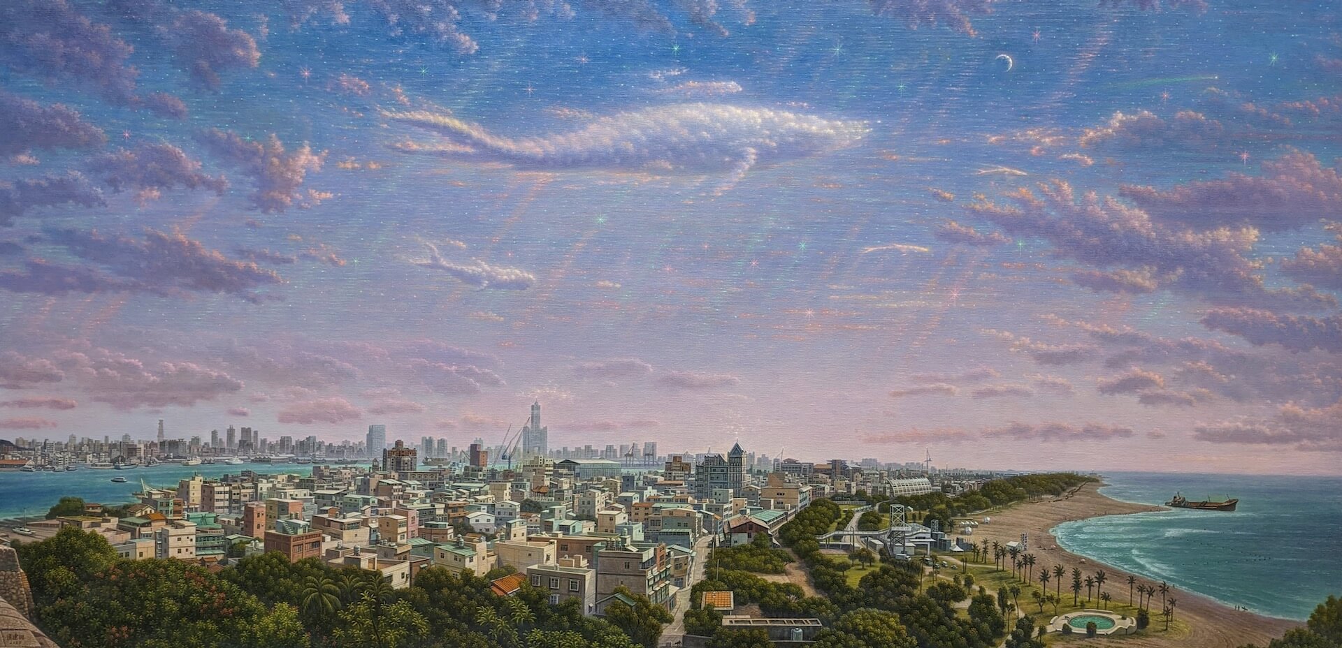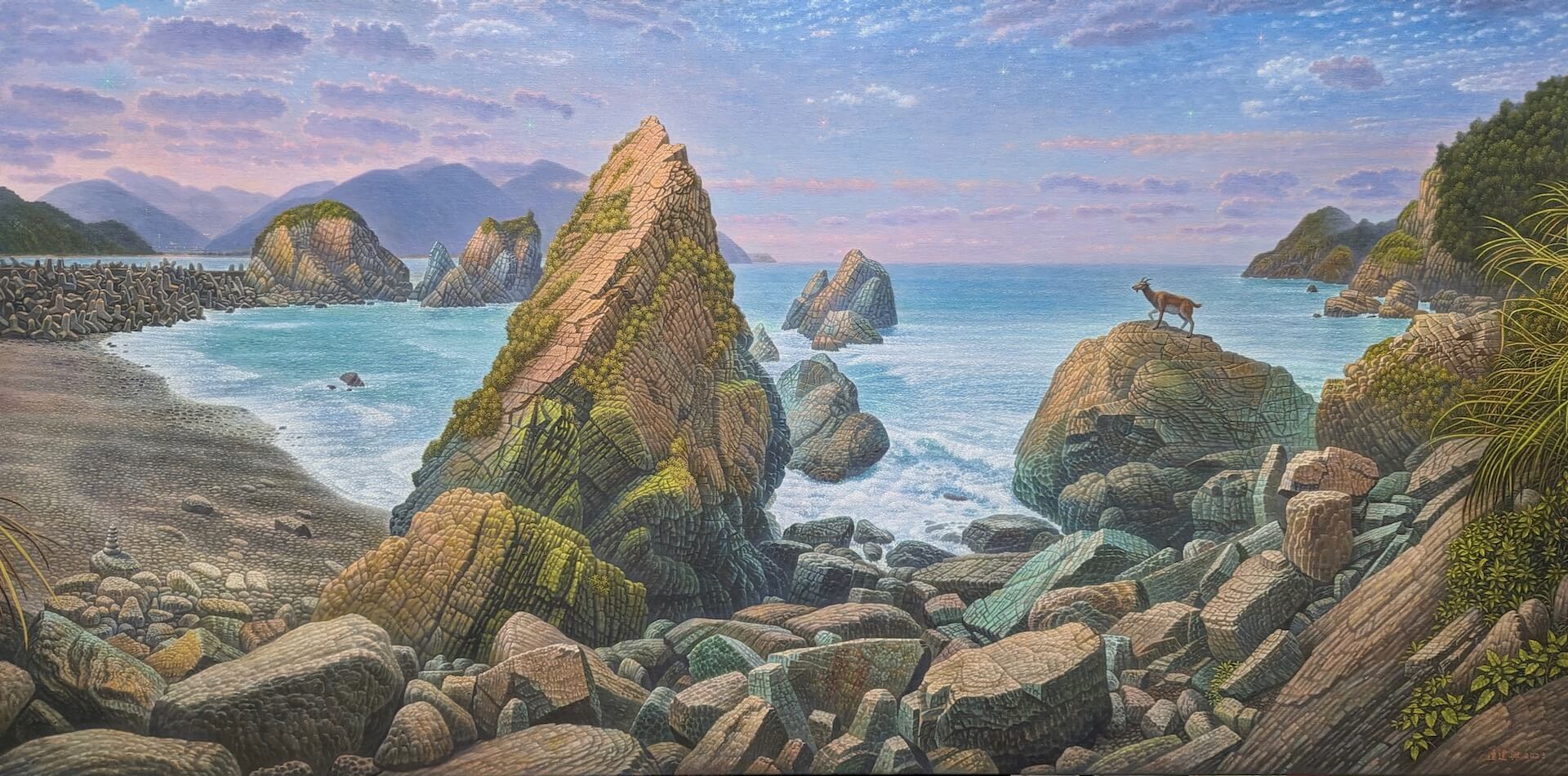 這次展覽包括:宛儒畫廊獨家經紀代理的魔幻寫實畫家連建興,他以超現實魔幻的寫實風格與意境著稱於臺灣藝壇。目前也是國內最有活力的畫會悍圖社重要創始成員,連建興的繪畫表現以精緻細膩的畫筆畫出對臺灣這塊土地的情感,重點是從具象描繪中跨越到魔幻的山海場景,畫家精心的布置畫面的構圖,讓物象妥貼安置在宛如詩篇劇場中,隨著點描筆觸的啟動節奏,似夢似幻的風景漂浮在我們的視網膜內與心相會,感受畫家為我們帶來土地的溫潤情感,產生心有戚戚焉的共感。