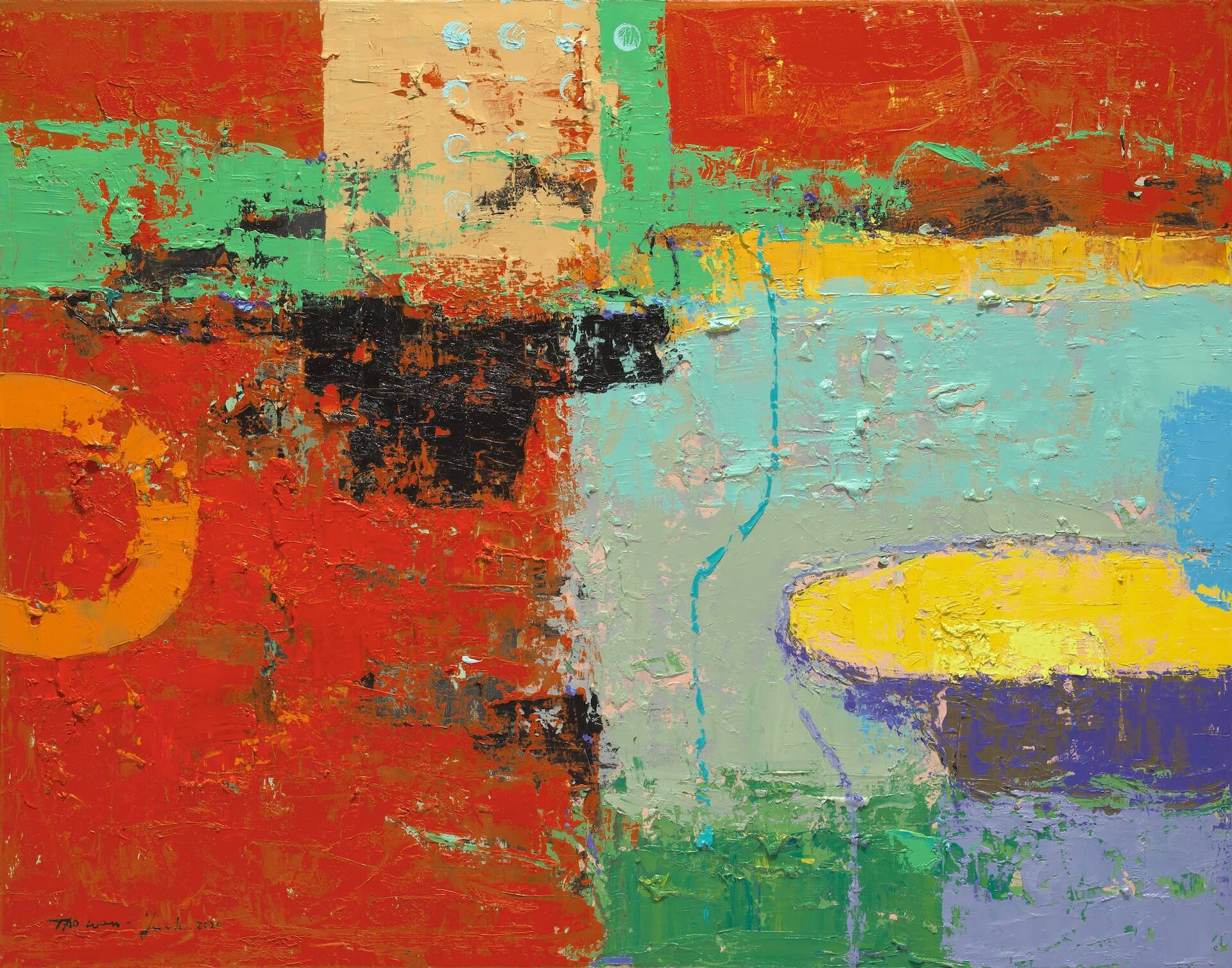 留法的抽象藝術家陶文岳,他的國內外展歷豐富,既是藝術家、藝術評論也是專業的策展人。他的創作以抽象風格為主,著力於點、線、面、符號與色彩的創作,喜歡使用互補和對比色彩,來自於對東西方記憶的回憶描述,從過去、當下的記憶跨越到對未來的臆想憧憬,讓時間與空間在古今穿梭對話,不受限於造型的拘束要求,讓感性與理性架構並存,企圖營造出某種世界的和諧感,也帶動觀者對視覺美感欣賞與情感共鳴。