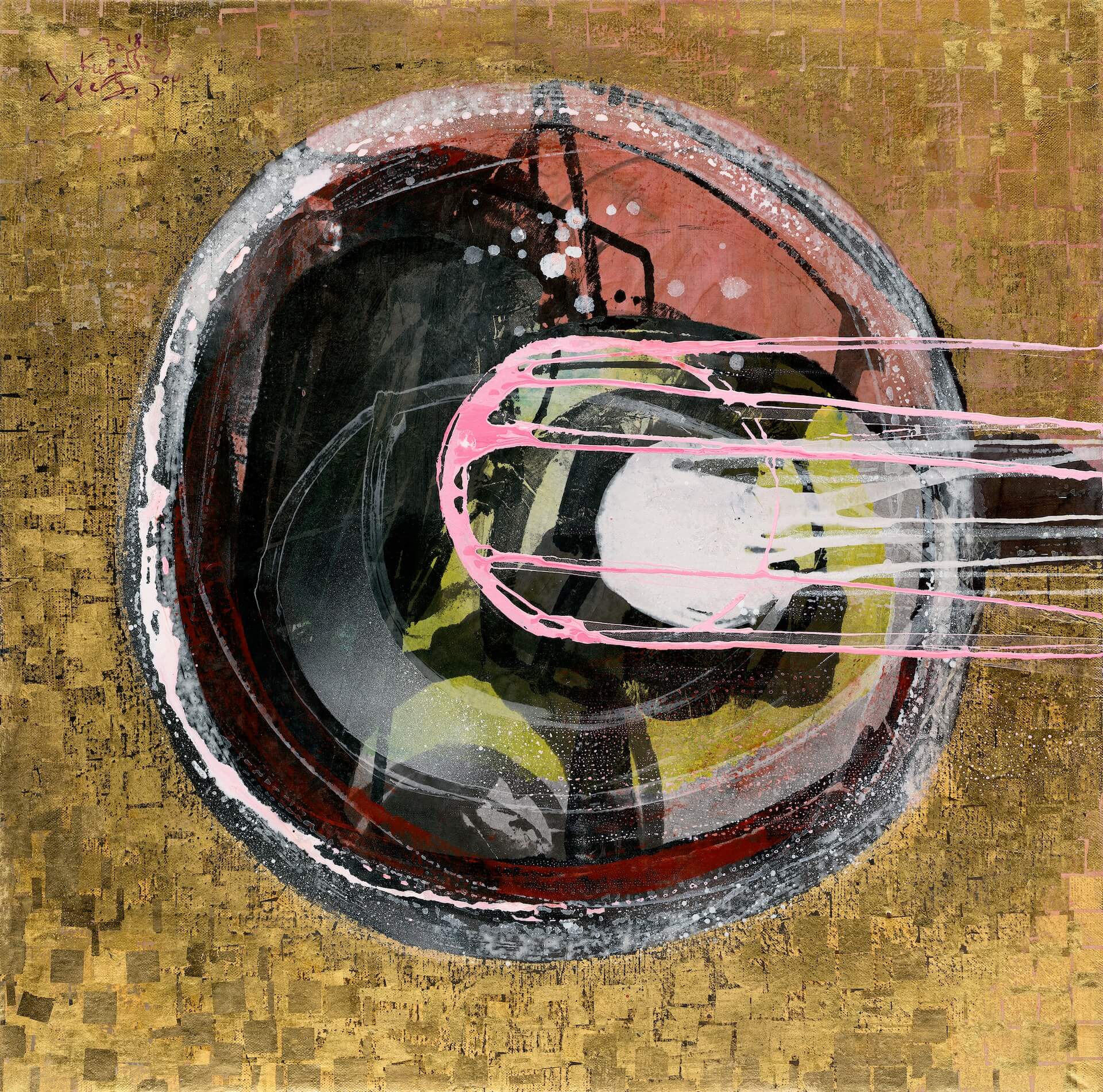 留美的郭博州,目前是任教於臺北教育大學藝設系教授,他結合水墨與西畫的創作元素,從後現代的理念中深入研究,拼貼式的構圖,中西並序與情趣相同相異的創作,近作在抽象的結構中,特別以唐宋元名清古畫中點景的人物或動植物來增添畫面的視覺感出口,這是來自於對COVID-19疫情下的覺悟,類似於藝術療癒拋棄恐懼而營造安定感,也讓畫面多了不同面象與角度得省思,顯示出深厚的文化底蘊無為而包容。