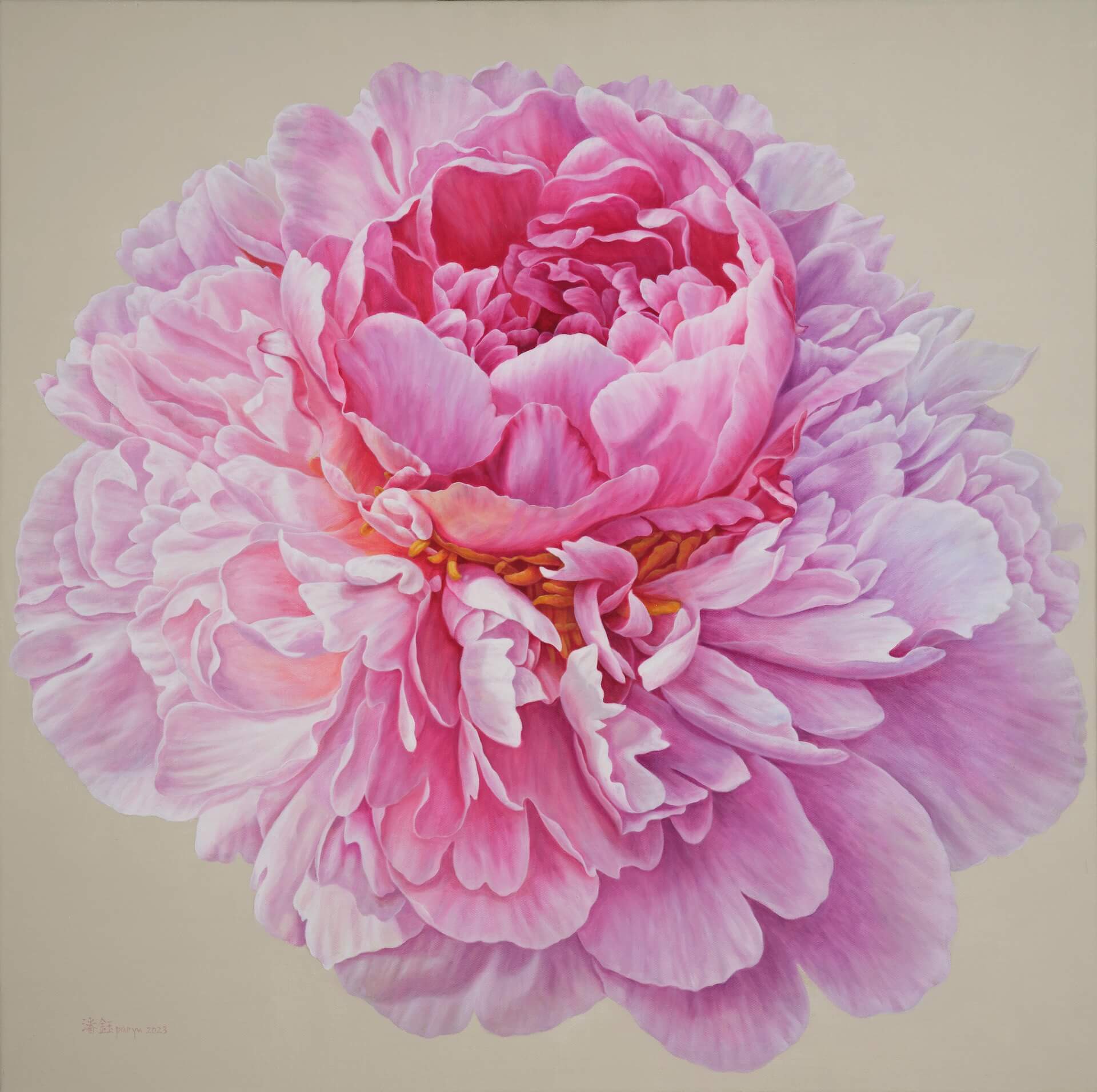 知名的女性藝術家潘鈺,也曾當過臺灣生猛的畫會台北畫派的執行長,比較以往她對鎖的具象造型創作實驗,這些年來她轉變風格專畫牡丹花油畫而聞名於藝壇。她擅描畫綻放的牡丹花,碩大花朵新鮮柔嫩的質感,顏色各異曲折蜿蜒的線條與造型,花的符號與畫家的名字似乎聯結在一塊,看到花就聯想到潘鈺,人如其畫花也婉約典雅,鍾情於花的研究,從其中衍生出萬般的可能性變化令人印象深刻。