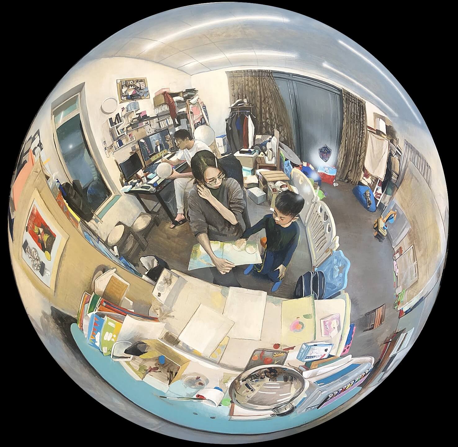 以「微距」精密寫實知名的青年畫家余昇叡,目前也是宛儒畫廊的經紀藝術家,他擅長金屬光影質感徐徐如生的描繪,近年來專著在立體球型上的繪畫創作,這是一個困難度相當高的創作,首先要克服球型體本身弧度差異的變化,跟一般平面創作有很大差距。另一方面畫家不設限主題的要求,寬廣嚐試不同題材挑戰,像家庭的群像創作、世界足球賽重要球星比賽的場景,還有世界各地著名美術館的建築空間刻畫等,都顯示這位畫家面對不同繪畫主題和造型的挑戰而令人驚艷。
