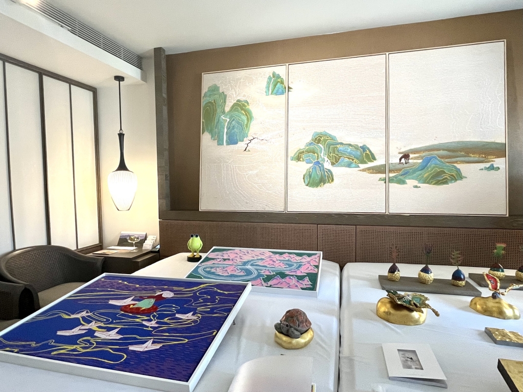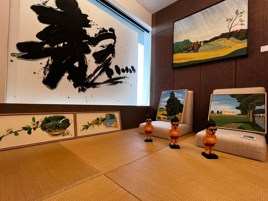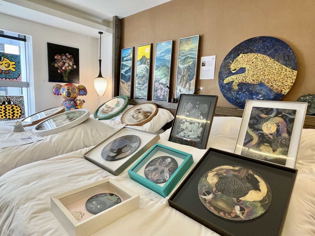 來自彰化的藝點點文創美學特別以「龍.攏.隆」為展覽主題,意在龍年聚合、匯集、創造豐饒能量,藉此傳遞給世界美好祝福。本次由藝術家洪易領銜,匯集王明仁、王德合、方文山、林函葦、梁月、曾韋翔、張立曄、黃柏維、德國藝術家朱利安(Juliane Hundertmark)、西班牙藝術家皇.雷普耶斯(Juan Ripolles)等十位藝術家參展。洪易的作品風格鮮明且造型討喜,本次展出的小型作品更適宜居家擺設;而年逾90的皇.雷普耶斯亦展現出用色強烈的作品,兩者互為呼應也深刻反映出策展概念的正向能量。新生代藝術家林函葦以傳統國畫技法為基底,以自身喜愛的貓科動物為主題,展現的細緻溫潤畫風充滿療癒氣息,亦是她對生活的暖心祝福。而黃柏維以膠彩繪製的動物畫作,也同樣反映其對造型能力的純熟掌控。
