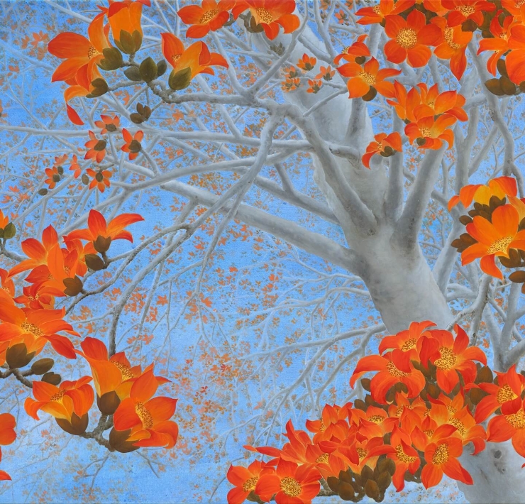 曹小容的早期作品深受美國抽象表現主義影響,以抽象筆觸與形色變化來探索女性內在生命。近期轉趨對自然的觀察與體悟,從抽象、內化的能量形式轉為具象且細膩的風景圖像。在日常風景中,探索如水中相映的虛/實之象,抑或是波光瀲影的水波,雲影落下的山巒,以寫景之心,綿密之筆,細細織就出每一幅平常又不尋常之風景。