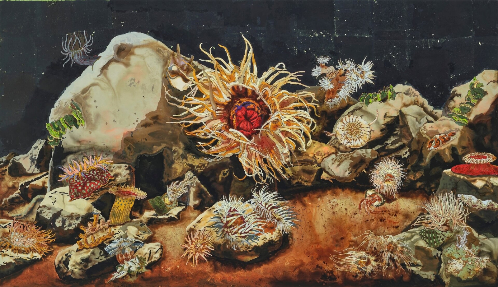 蕭珮宜自2023年於赤粒藝術個展後,迎來閃閃發亮的一年——中國信託當代繪畫優選、臺北市立美術館收藏及展出。蕭珮宜的作品湧動著向死而生的希望微光,充滿著對人與環境的生存提出疑問,發出關懷。她曾自述:「我的作品融合了貼箔、繪畫與版畫等媒介,擬構想像中的場景。相較過去倚重絹印版畫進行部分製作,這次我嘗試了更多手繪的方式,去凸顯色彩的厚實感與繪畫性。……我試圖美化無能為力的狀態,使這個狀態開展出殘破的燦爛,獲得被注視的可能。人間樂園裡『災難的變形』與『人性的廢墟』都是建立在這種相對性之上,與真實人生相互周旋。」
