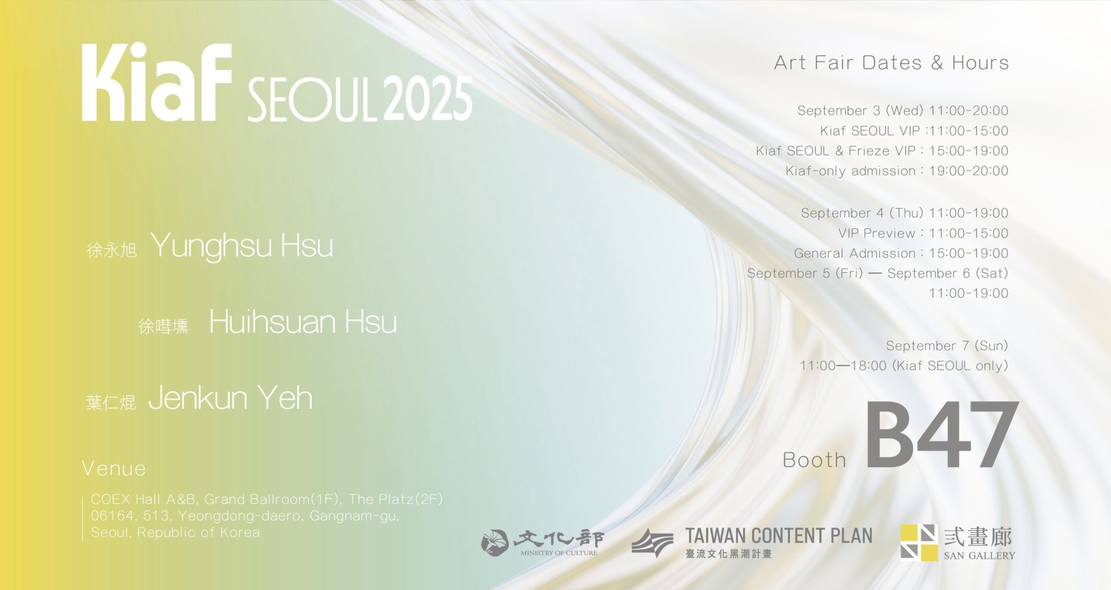 弎畫廊自創立以來積極參與國內外藝術博覽會與國際合作展,此次參與Kiaf Seoul 2025,很榮幸邀請臺灣重要知名藝術家徐永旭(Hsu Yung-Hsu)、徐嘒壎(Hsu Hui-Hsun)、葉仁焜(Yeh Jen-Kun)赴韓展出,是弎畫廊邁向國際的重要一步。11月將進駐臺南百年歷史建築「偕行館」,喬遷首展也將由徐永旭開啟結合當代藝術與歷史空間的新篇章。