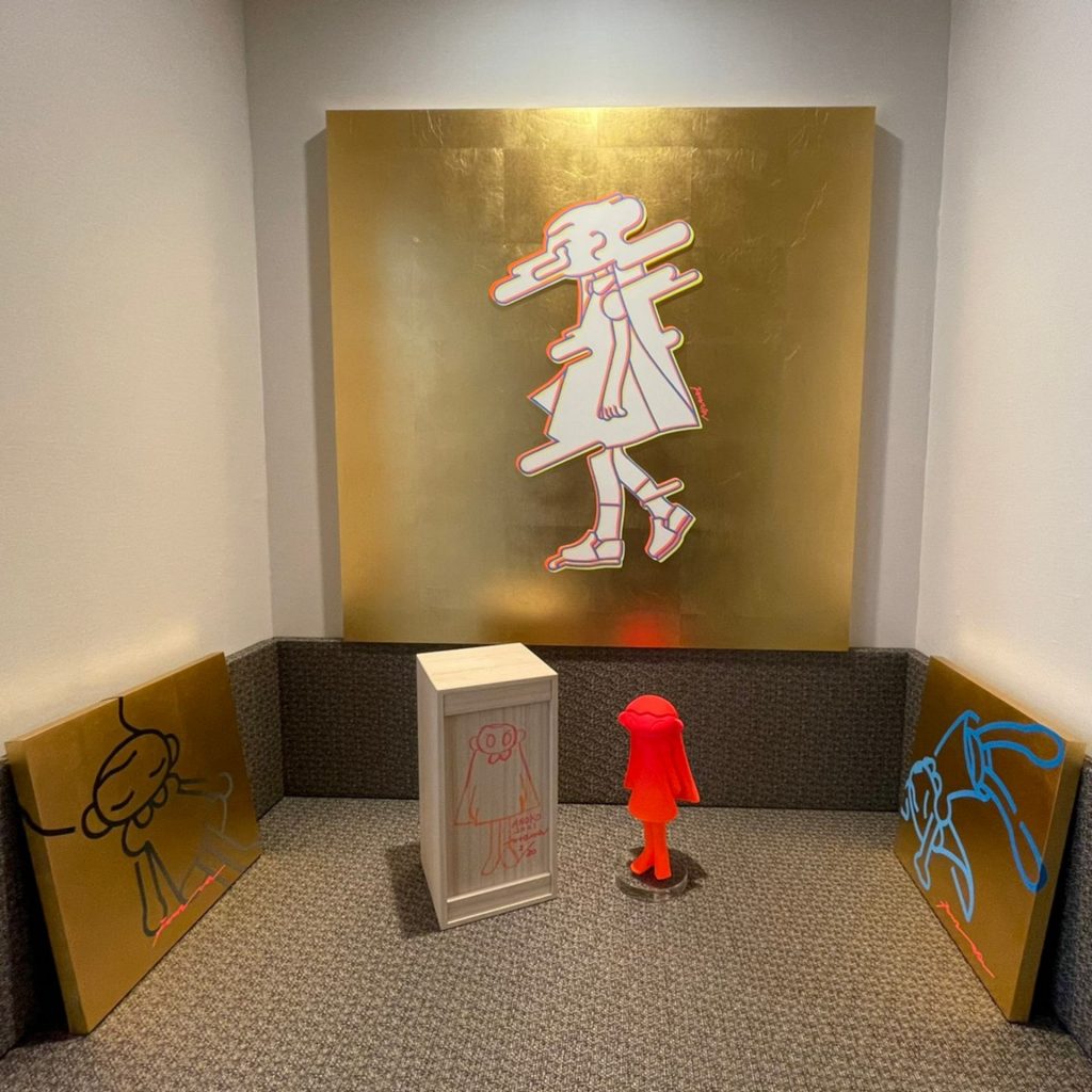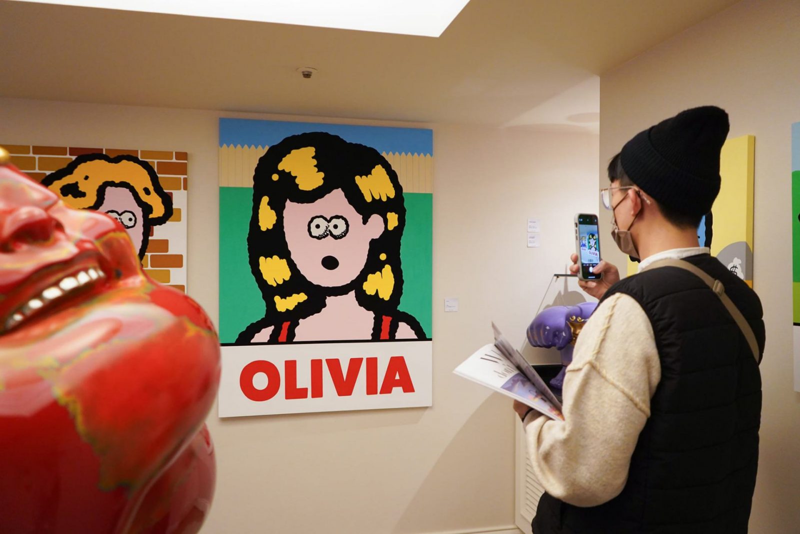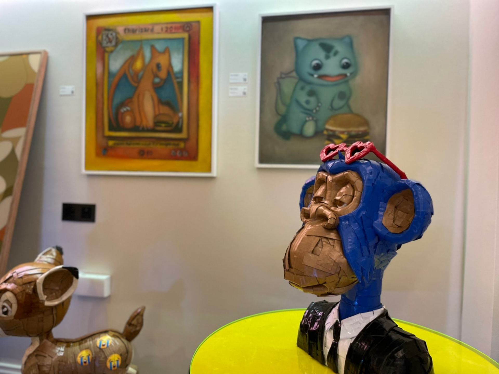 除傳統藝術收藏形式外,也在展會中發現,潮流藝術的藏購途徑及形式也正在轉變。首次參與ONA 2022的plzzzz 藝廊為國內大型策展顧問公司INCEPTION啟藝的旗下品牌,本次展出來自美國、加拿大、英國、西班牙、日本、韓國等地的多位當代潮流藝術家繪畫、公仔及雕塑作品,同時開放以太幣(ETH)支付交易。展覽現場,加拿大女性潮流藝術家LAURENCE VALLIÈRES以硬紙板創作、名為《Blue Ape》的雕塑。乍看之下,作品創作以NFT界成交價最高的「無聊猴子」(The Bored Ape Yacht Club)為主體意象,據悉,《Blue Ape》早於預展日就已被歌手林俊傑藏購。此外,1月11日於天母開幕實體空間的丁丁藝術空間也在OAT 2022中呈現多位多位海外及台灣合作藝術家的創作,同時,畫廊也再度帶來了重磅潮流玩具BE@RBRICK限量公仔,詢問熱度極高。