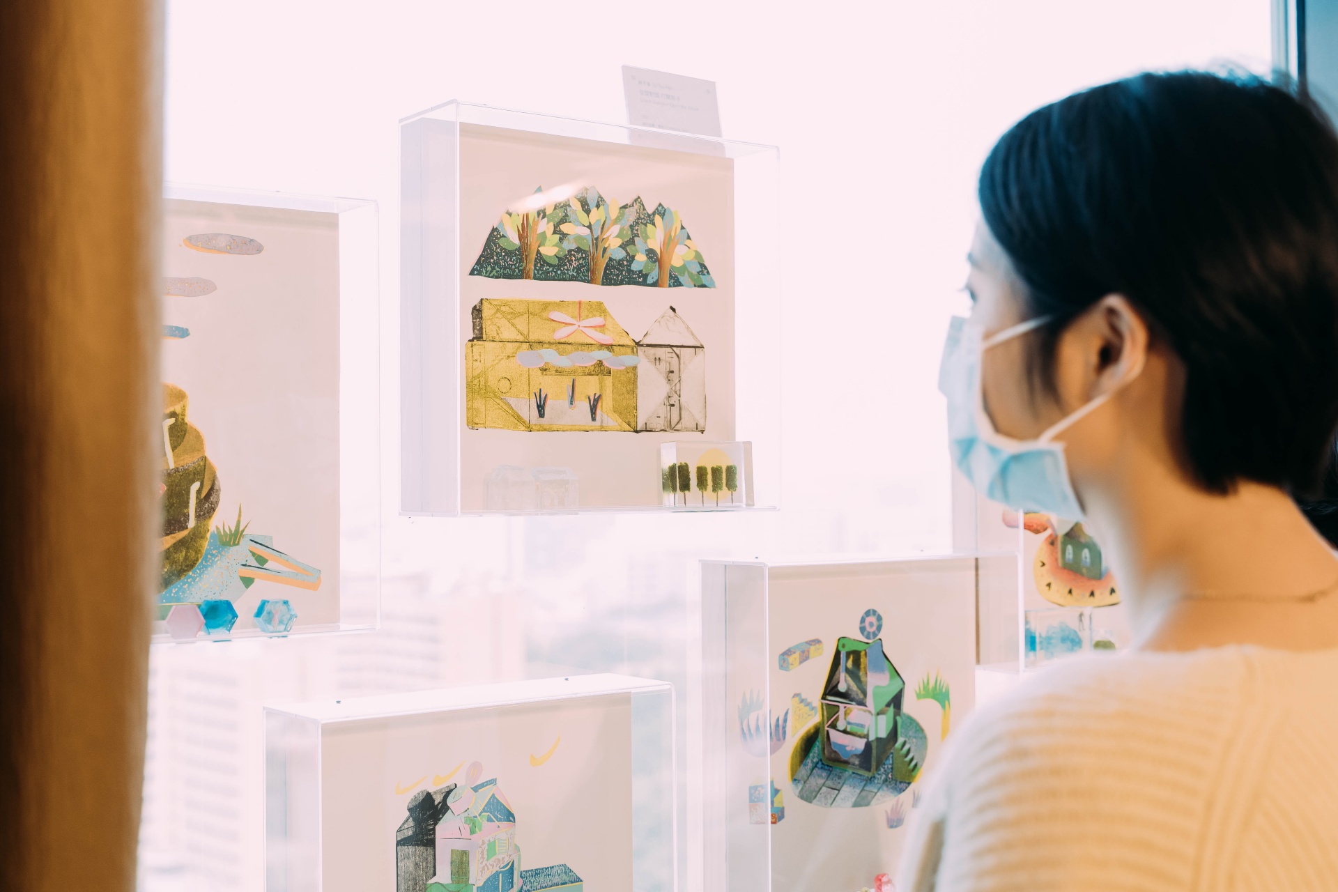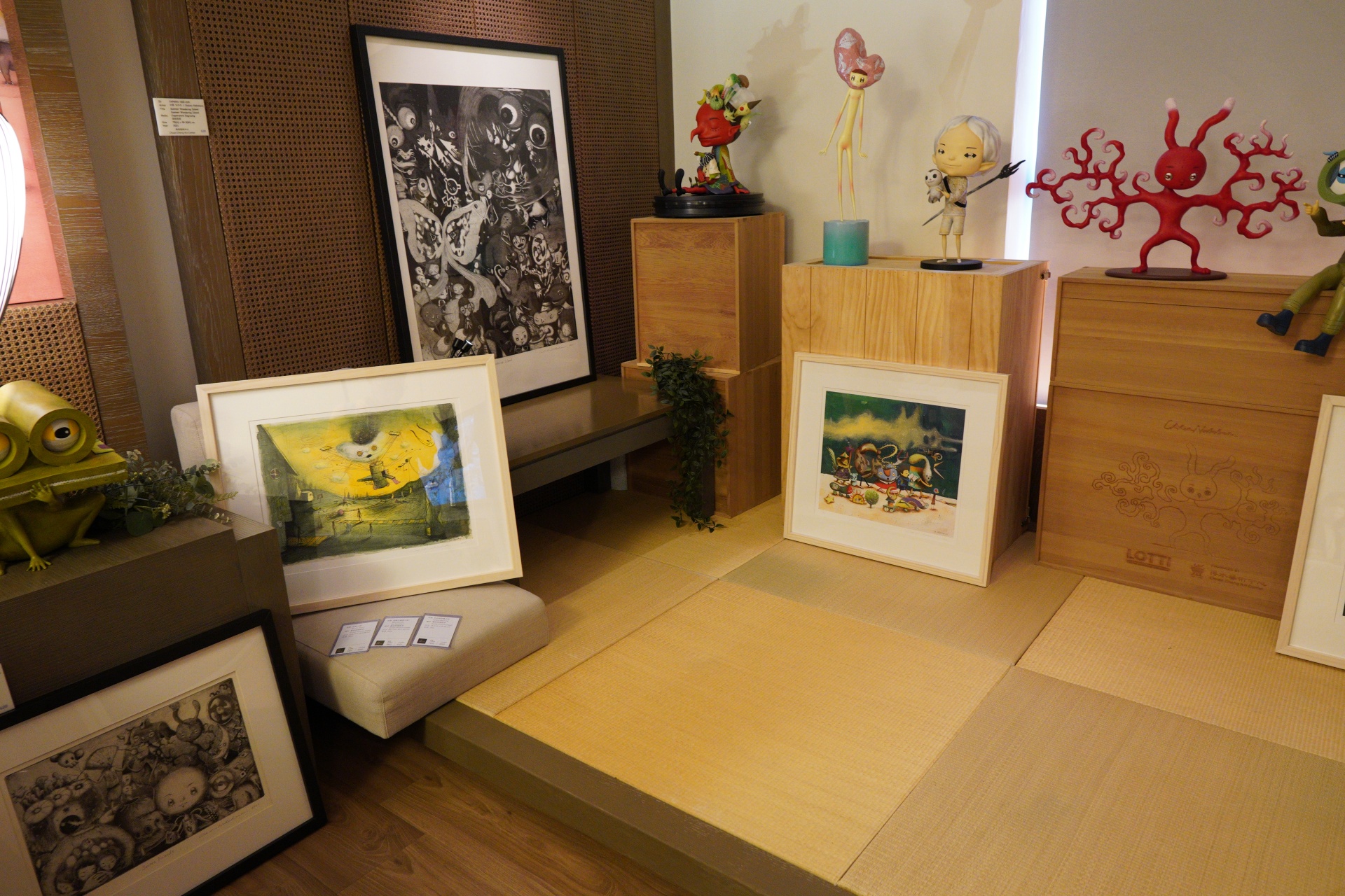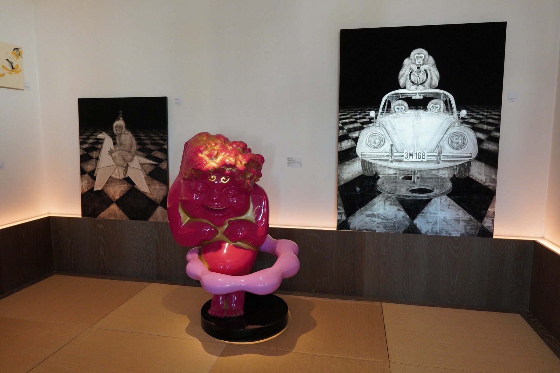 大雋藝術呈現藝術家蔡尉成、王曉勃、林俊彬,以及中國藝術家石建國、日本藝術家群白田誉主也、樋口明宏及樋口新的精選作品。白田誉主新作延續夜半時刻銀輝下的劃時空漫想主題,畫中可見猴子騎乘著熱氣球、摺紙馬及玩具車音樂盒,尋找夢想中的居所,整體呈現夢境國度般的超現實氛圍。企圖跳脫侷限的環境向外追求自由,充满憧憬和希望之祝福寓意,期盼看到作品的觀者都能感染到快樂氣息,為自適快活的理想願景繼續前行。