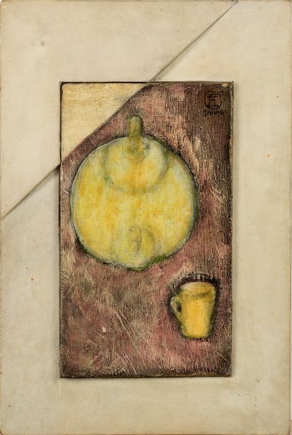 另一幅1927年的《黃茶壺》,常玉也不忘從他的原生文化裡汲取茶道具的靈感。畫家採用了鳥瞰的方式描繪,單純的畫面構圖中,描寫一隻黃色茶壺與茶杯,我們可以很容易地想像到茶壺所處的桌子不斷地延伸。幾何性的表現傾向與多角度的對象描繪,讓人聯想到像是塞尚或馬諦斯般對於顏色與型態的嘗試,但單純的構圖與平面化的表現,又可以聯繫到常玉自身的東方源頭,再次呈現出東西方交融後的特殊樣貌。