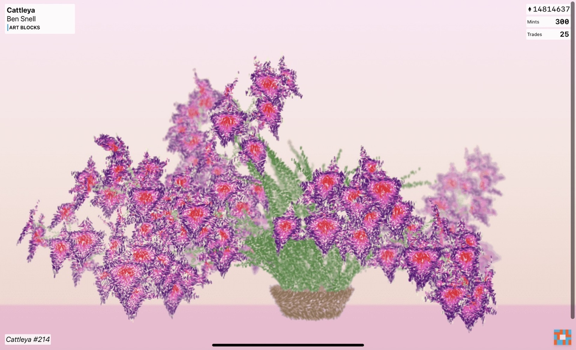 在《典藏ARTouch》首日於台北當代的直擊報導中,我們便關注並介紹班.史奈爾(Ben Snell)這位跨媒體藝術家在「ART BLOCK」推出的生成式NFT創作《嘉德麗雅蘭》(CATTLEYA)。他以蘭花為此次創作的主軸,並以生成式的圖像演算技術,借喻蘭花在人類歷史中作為觀賞植物、其因為與飛蛾或人類等生物的物種關係,持續演化出的多樣性。從昨日至今一共mint(鑄造)了300個token(令牌),該系列創作目前已售出25個、每顆售價1.5Ξ(以太幣)的令牌。