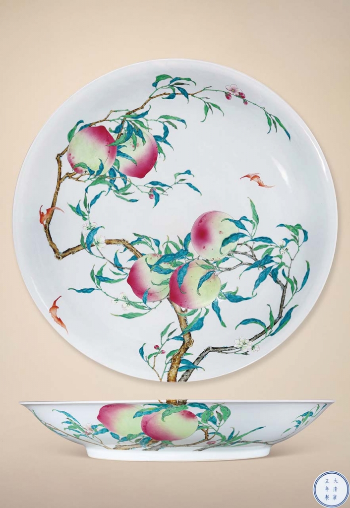 最受矚目者,當屬出自十面靈璧山居珍藏的清雍正〈粉彩過枝福壽雙全八桃五蝠大盤〉,以3852萬5000元的高溢價成交,位列此次北京保利2020年秋拍中國古董珍玩板塊成交榜首,同時亦是2020年秋季拍賣香港、北京兩地瓷器成交價之榜首。此盤為敞口,弧壁,圈足,盤心以粉彩繪一株蒼茂桃樹,沿盤壁蜿蜒伸展至外壁,枝上雅繪盛開桃花,繽紛花蕾,八顆嫣紅桃實,五顆於盤內,三顆於盤外,渾然一體;桃枝盈間,以礬紅繪就三隻蝙蝠飛舞於盤心,另有兩隻繪於外壁,底足青花雙倭角方框內書「大清雍正年製」六字三行楷書款。此類盤於歷年市場拍賣出現與私人收藏者,存世數量計不過20件,其中如本件之尺寸者極罕,可謂珍貴之至。
