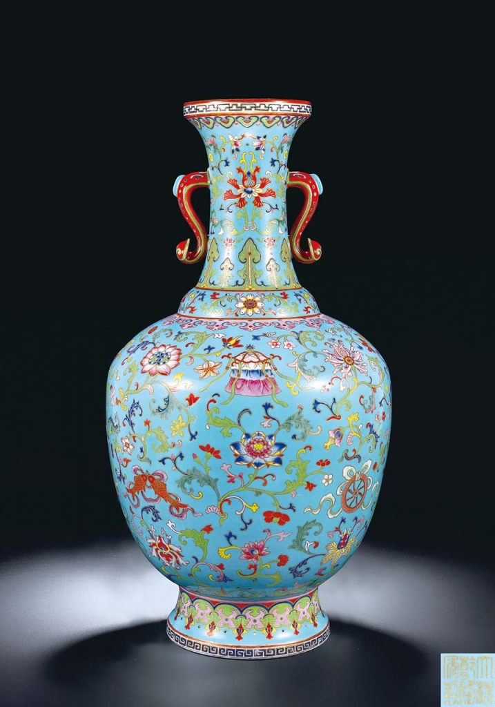 「雲潤星暉:放山居、十面靈璧山居暨海外名家藏盛清瓷器」專場雲集眾多的名品瓷器,來源顯赫,矚目焦點拍品為英國放山居收藏瓷器清乾隆〈御製松石綠地洋彩描金蓮托八吉祥紋如意耳大瓶〉,瓶身尺寸碩大,仿掐絲琺瑯而製,以金彩畫骨,風格近於洋彩瓷作,摹仿西洋光影畫法,紋飾華麗繁縟,非一般常規官窯瓷器,極具創新之意,堪稱乾隆官窯中別緻的代表,估價2200萬至3500萬元,成交價4130萬元。清乾隆〈藍地軋道粉彩開光重陽菊花紋節令膳碗〉一對,此對作品製作上乘,端莊秀雅,宮廷氣息濃厚,估價350萬至550萬元,經過數十輪激烈競投,以731萬6000元高價成交。
