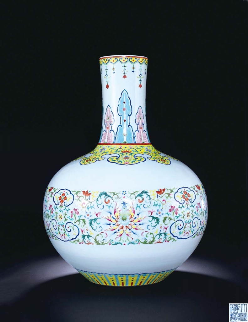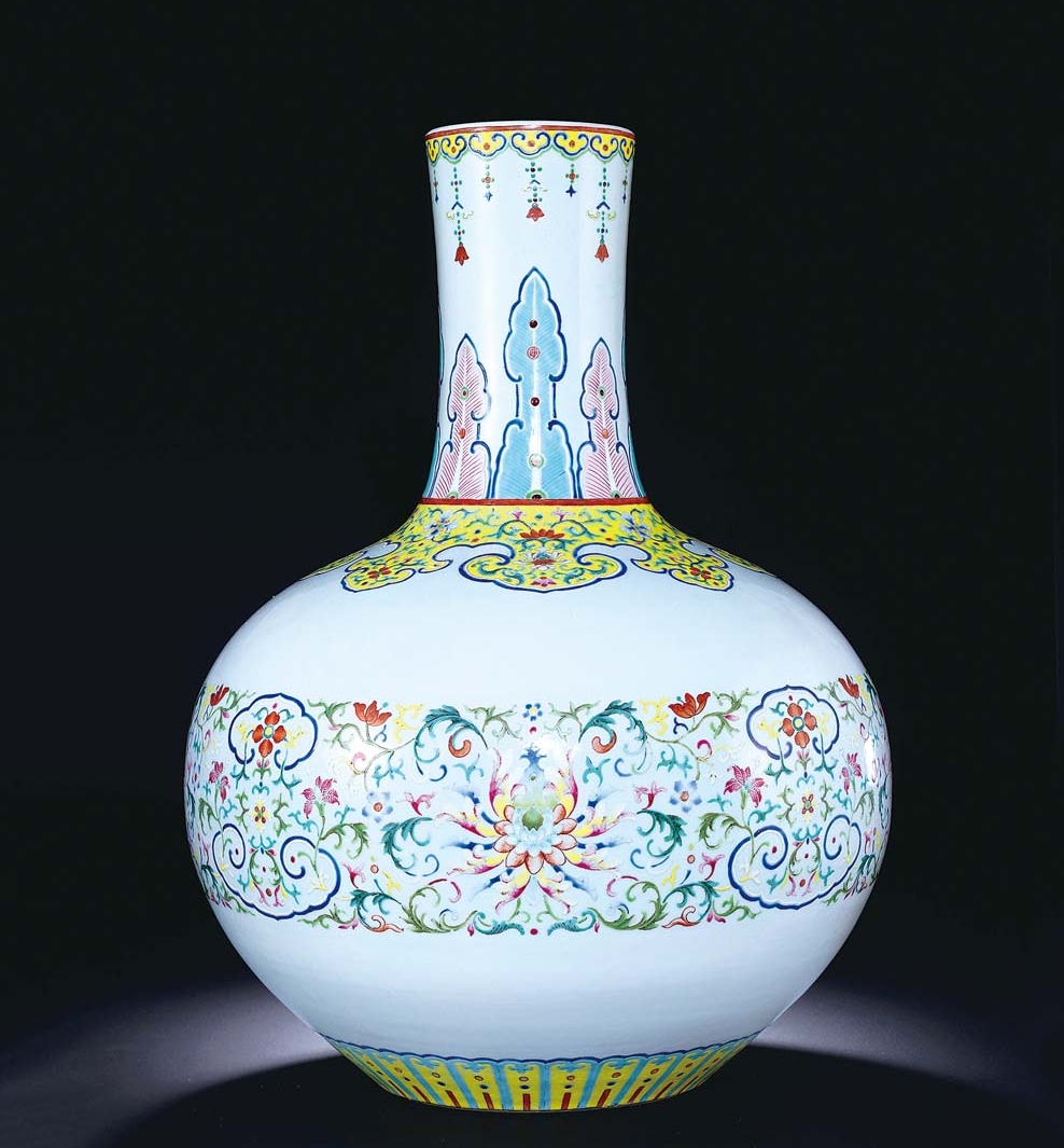 「重要中國古董珍玩」專場,清乾隆〈粉彩纏枝西番蓮紋天球瓶〉,此瓶氣韻婉約雅致,帶有濃郁的西洋巴洛克風格,屬於西風東漸之下的重要見證者,以白釉為色地,並一改乾隆彩瓷雍容繁縟的面貌,紋飾之間留白較多,層次清晰,頓生清新雅麗之氣,為乾隆御瓷少有之個例,估價1200萬至1800萬元,以1711萬元成交,榮膺本場之最。明永樂〈銅鎏金金剛手菩薩〉,整體造型圓融飽滿,典雅端莊,肢體細節精湛,呈經典永樂時期漢藏交融之宮廷造型風格,估價480萬至680萬元,以566萬4000元成交。