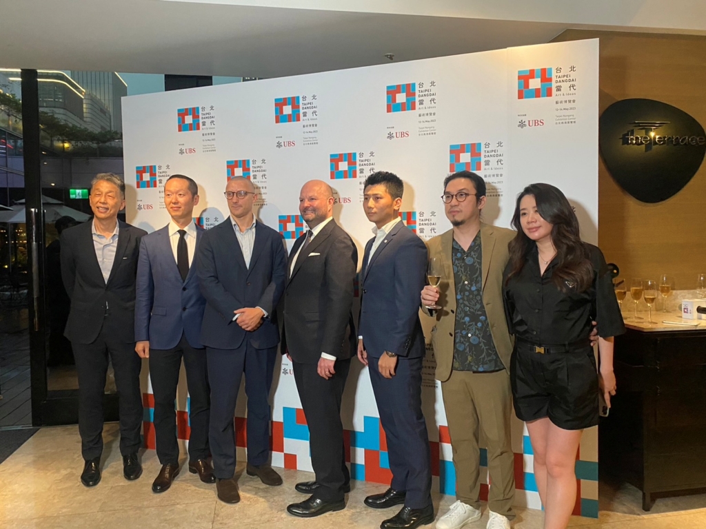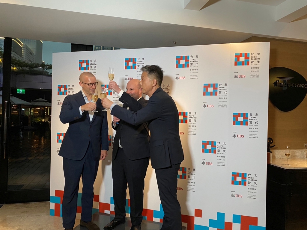 台北當代聯合創辦人暨聯合總監任天晉(Magnus Renfrew)、台北當代聯合總監岳鴻飛(Robin Peckham),以及瑞銀集團台灣區總經理陳允懋在12日晚間於台北艾麗酒店舉行「Warm up party 展前酒會」,為5月12日到14日開展的2023年台北當代許個好采頭。而貴賓預展及開幕晚會則在5月11日舉行。