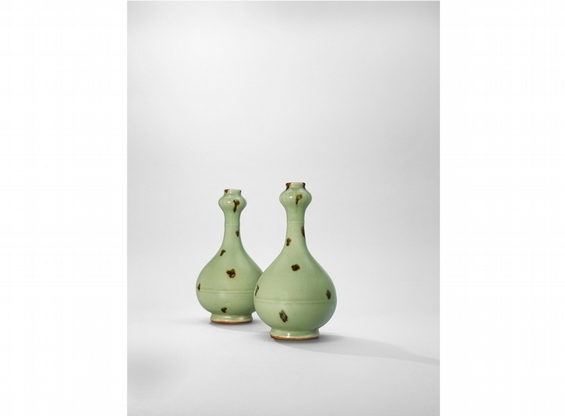 佳士得香港2016年秋拍養德堂珍藏中國古陶瓷專場:龍泉窯〈飛青瓷褐斑蒜頭瓶〉一對,以1206萬港元成交。圖╱佳士得香港。