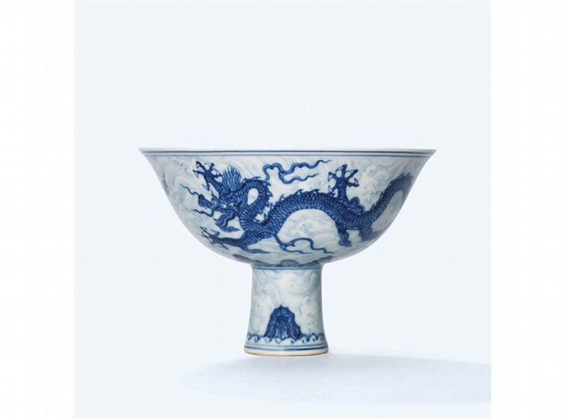 佳士得香港2016秋拍重要中國瓷器及工藝精品專場:明宣德〈青花海水雙龍紋高足盌〉,以6886萬港元成交成交。圖╱佳士得香港。