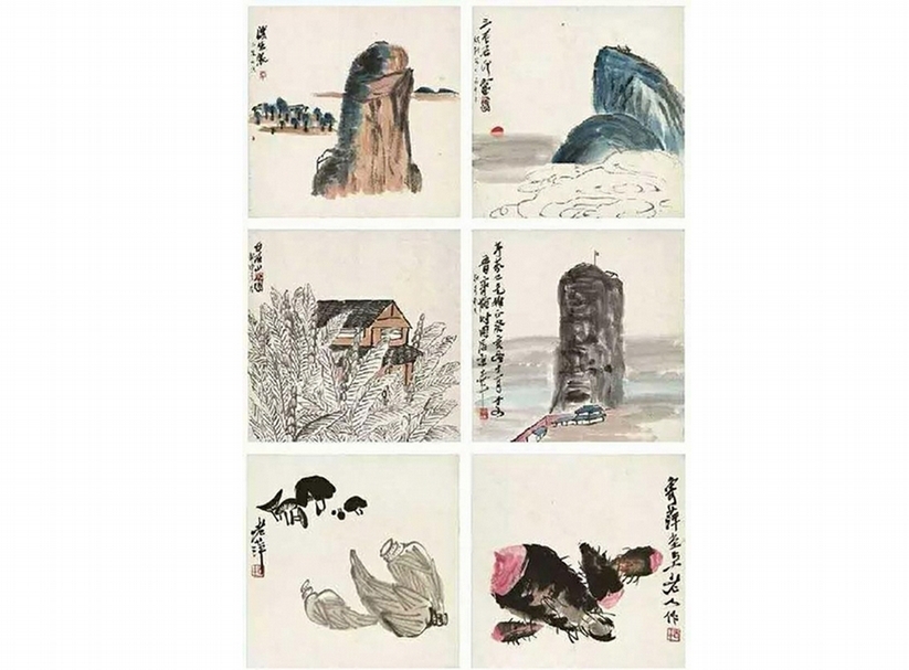 佳士得香港2016年秋拍中國近現代書畫專場:齊白石〈山水蔬菜雜冊〉,以1746萬港元成交。圖為其中六開。圖╱佳士得香港。