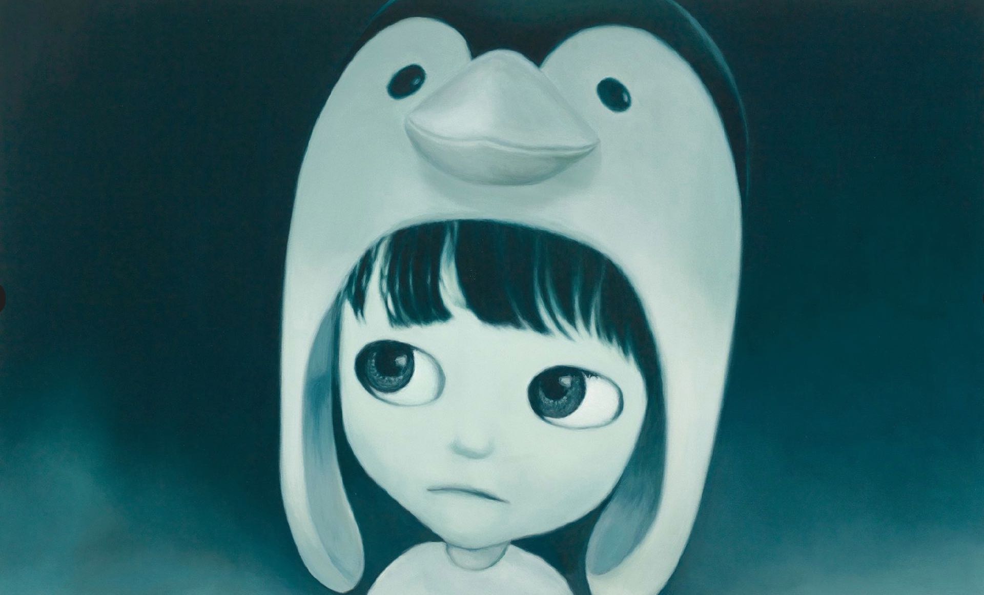 近日在拍賣市場火熱的日本藝術家山本麻友香大型油畫《企鵝男孩》(2021),以孩童作為主角,童話般的畫風,寧靜淡雅的色調,凝望著一雙大眼睛,藏著些許叛逆。漸層的藍綠背景凸顯孩童的潔白,疑惑沉思的神情,流露愛與被愛的可能。企鵝是白色大地中跳動的符號,男孩是童年世界的符號,這份溫柔與細膩的結合,造成了熱烈收藏的魅力。