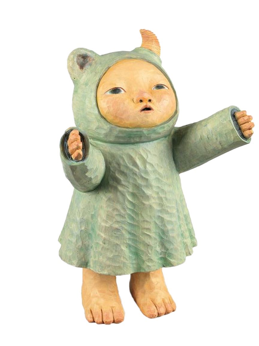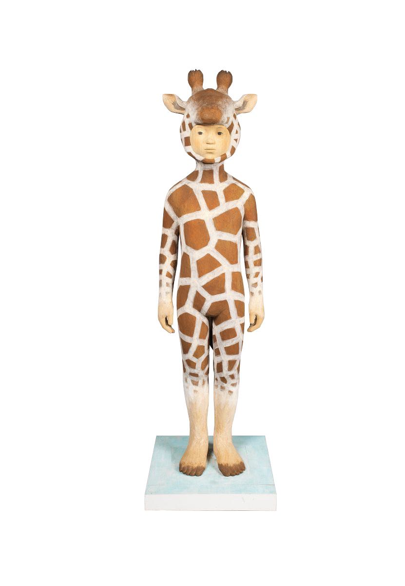 《動物人—長頸鹿》(2014)是小泉悟用日本傳統的木雕工藝,保留樸實的木雕手作感,披著動物外衣的小孩讓他成為當代藝術的話題人物。在長頸鹿的動物外衣裡,是一個孤獨的小孩,用眼神交換迷惘,迷惘孤獨的眼神中,若有所思的放空,小泉悟塑造出的敏感孩童,是我們每個現代人的投影,用藝術刻劃著孤獨,透過眼神凝望愛。