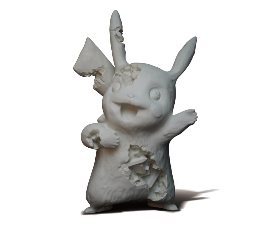 DanielArsham和Pokémon的聯名立體雕塑,以未來的考古學為設計理念,假想經過千年歲月的洗禮以後,Pokémon精靈如遭侵蝕風化的文物般被發掘。侵蝕、風化、結晶化手法的標誌創作,《被侵蝕的皮卡丘》(2020)呈現一種跨時空的超可愛。另一件雕塑使用青銅器材質製作,手工調製油性顏料塗以表面呈現獨特的銅綠,拋光處理過的水晶鑲嵌在《侵蝕噴火龍》(2022)的體內,豐富了卡漫角色的神話性。