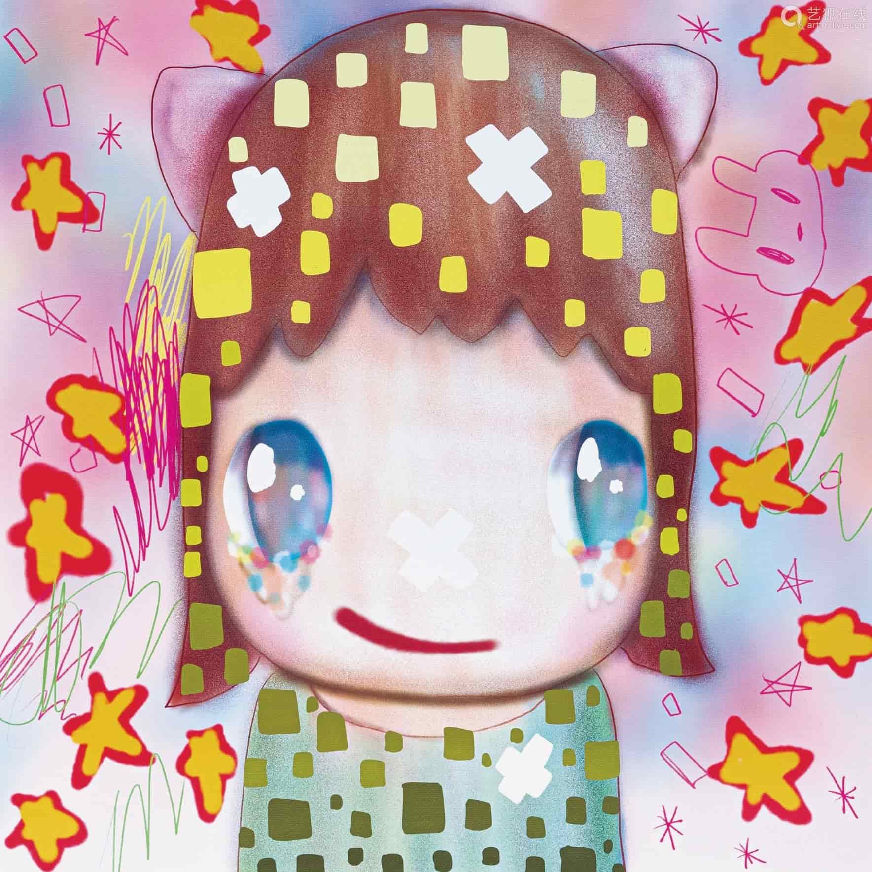 療癒系美國藝術家NIKKI以女孩為主角,作品《兒童生活大爆炸》(2021)的人物形象讓人聯想到奈良美智,色彩繽紛的馬賽克圖案,凸顯出小女孩的天真,是NIKKI翻玩童心的詼諧感。天野健《無題》,結合日本動漫文化以及傳統浮世繪,隨興瀟灑的塗鴉,襯托主角的溫柔善良,在奔放和俐落中間找到一種平衡,創造出美麗的巧合。中村萌《給我抱抱》(2018)雕塑融合熊孩子的調皮,以及小朋友幼稚可愛的肢體,作品上雕刻的手感,讓觀者想親近,給予甜蜜療癒的擁抱。