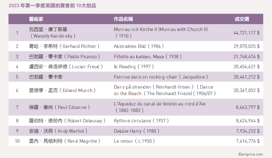 英國的出色表現通常主導了上半年的成績,傳統上,第一場大型現代藝術拍賣會會在倫敦舉行,而頗具聲譽的美國拍賣會總是在稍後的五月舉辦。因此,本季最佳銷售成績來自倫敦,以4,470萬美元拍出一幅康丁斯基(Wassily Kandinsky)繪於1910年的畫作《教堂與穆爾瑙風景 II》(Murnau mit Kirche II),1910年是這名俄國畫家的轉折點。這幅畫出自3月1日蘇富比策劃的一場品質非凡的拍賣會,當天有好幾幅傑作同時脫穎而出,特別是里希特(Gerhard Richter)的《抽象畫》(Absktraktes Bild,2,900萬美元)、畢卡索(Pablo Picasso)的《拿著小船的女孩(瑪雅)》(Fillette au bateau, Maya,2,170萬美元)、弗洛伊德(Lucian Freud)《正在閱讀的Ib》(Ib Reading,2,040萬美元)、挪威的孟克(Edvard Munch)一幅四公尺寬的畫作《在海灘起舞》(Dance on the Beach,2,030萬美元),這幅畫在納粹佔領期間被藏了起來,將近80年後再度出現)。