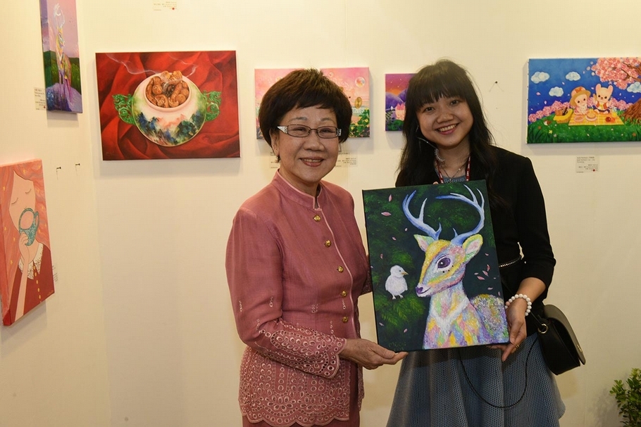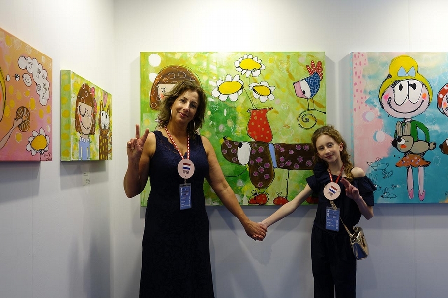 荷蘭藝術家Esther Ziher-Ginczinger,與11歲的女兒Lima Ziher及9歲的Riva Ziher再度聯手參展,成為全場亮點,Esther母女的畫風幽默童趣,多取材自日常生活,透過富含想像力的造型和鮮豔的色彩,表現家庭、愛與幸福等主題,單件作品要價約10萬元,去年參展作品全數售出,今年Esther和兩位女兒不但再度參展,更來台與民眾互動,親和力十足。