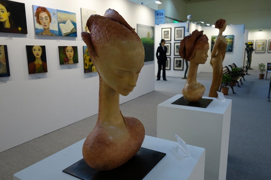 新藝博舉辦的「2019國際藝術家大獎賽」,則從4千多件參賽作品中,精選3百多件入圍,並於展會現場一字排開,內容、媒材和形式多元紛呈,展現來自世界各地的創作能量。今年的「國際藝術家沙龍大展」展區即邀請去年獲獎的藝術家參展,例如印度藝術家Bhaskararao. Botcha在凝重、鮮豔的油彩肌理上,描繪繁複交纏的細葉,形塑富含生命力的樹木姿態;同樣來自印度的Reba Mandal,去年得獎的畫作以貓為題材,該系列受到藏家歡迎,幾乎售罄,今年帶來風格殊異的全新作品,包括「恆河」系列和「天地之景」系列,畫面以寧靜幽曠的灰黑和冷藍色調,帶出印度河域的神聖氛圍。