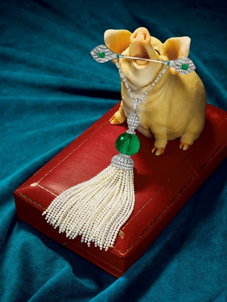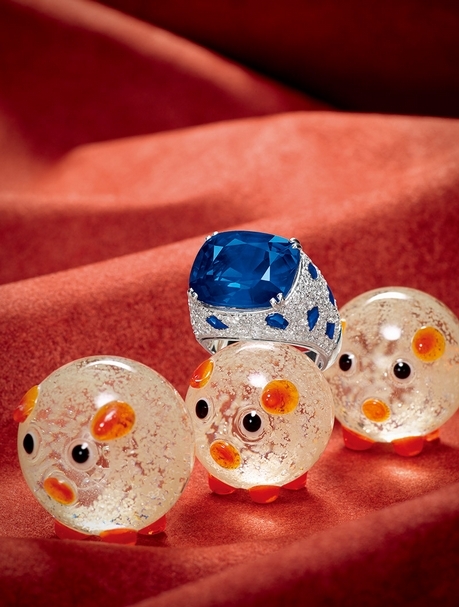 童趣感十足的「飛天小豬」以共重約27.55克拉的粉紅色剛玉鑲嵌而成,捧著以粉紅色石英石製成的豐滿大肚,造型生動。設計師更巧妙地於吊墜內打造愛神丘比特像,於晶瑩剔透的粉紅色石英石中穿透,若隱若現,為可愛的小豬增添一點浪漫。