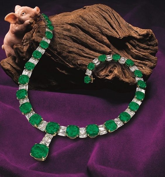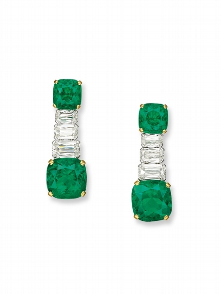 哥倫比亞祖母綠以其豐潤迷人的色調聞名,是多年來備受藏家追捧的瑰寶。今季拍賣呈上的祖母綠套裝為品牌Bulgari及William Goldberg聯手之作,共重130.28克拉的古墊形祖母綠為Bulgari出品,襯上共重46.01克拉、William Goldberg專利的Ashoka切割 (Ashoka-cut) 鑽石,綠、白相間的設計簡潔大氣、別具一格,將祖母綠的誘人美態昇華,突顯哥倫比亞祖母綠華美尊貴的氣質。