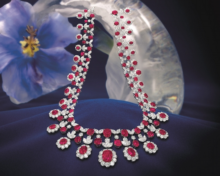 天然紅寶石大多產自亞洲,其中最舉世知名的為緬甸抹谷紅寶石,其捲曲斜狀物質,將紅色光線折射到寶石的每一個切割面,綻放均勻艷紅的色彩。此項鏈共由84顆天然緬甸紅寶石組成,總重量近140克拉,主石更重逾12克拉,為近十年拍場上最具份量的紅寶石項鏈。每顆天然紅寶石色澤純正殷紅,部分更被瑞士珠寶研究院(SSEF)及曼谷寶石實驗室(Lotus)評定為「鴿血紅」色,配上共重約101.25克拉的炫目白鑽,組成一朵朵俏麗花兒,仿佛能凝聚四周的空氣,艷驚四座。