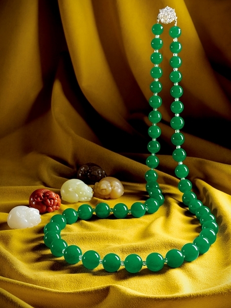 云云翡翠首飾中,翡翠玉珠項鏈可謂最彌足珍貴,因為雕琢翡翠玉珠須耗損大量品質均一的玉材,又要經過繁複的打磨工序,才能製成圓渾無比的翡翠珠子,現今品質上乘的翡翠珠鏈實在珍罕難求。此天然翡翠配鑽石項鏈每顆珠子碩大飽滿、青翠碧綠、水頭充足,能配對共49顆如此絕色的翡翠珠子,更是難能可貴。此拍品充分展示翡翠寓意的美德賢行,婉約秀美。