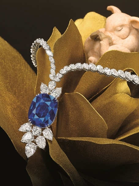 藍寶石傳譽古今,象徵權貴,更是愛情的象徵。皇室成員以藍寶石作為交換的信物,視它為摯誠的愛情盟誓。這條由殿堂級品牌Harry Winston出品的項鏈,以碩大明淨的43.89克拉斯里蘭卡藍寶石作主石,伴以共重約31.75克拉的鑽石,彰顯「皇家藍」藍寶石的細膩光彩,奪目不凡。項鏈為Harry Winston的經典款式,設計與著名的Taylor-Burton Diamond鑽石項鏈相似,是永垂不朽的華麗傳奇。
