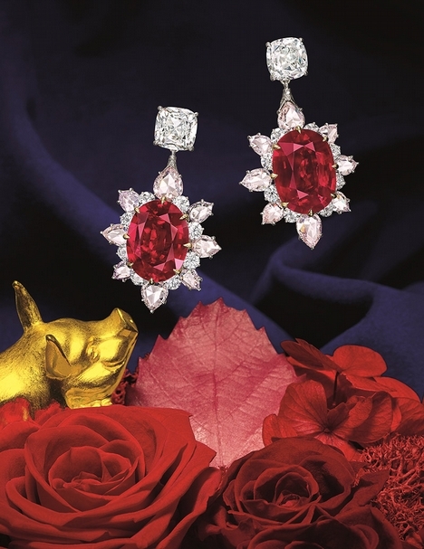 隨著緬甸礦源日漸枯竭,同樣熾紅熱烈的莫桑比克紅寶石越來越受追捧,價格屢創新高,成為珠寶收藏界的新竉。因此,優質的莫桑比克紅寶近年亦出現供不應求的情況,逾10克拉以上的更是稀有,此兩枚紅寶石更分別重14.54及13.12克拉,具有頂級「鴿血紅」色澤,加上配成一對、各重3.15克拉的老礦式切割(Old-mine-cut) 鑽石,以及共重約5.50克拉的粉紅色鑽石及鑽石,設計歷久彌新,玲瓏柔美。