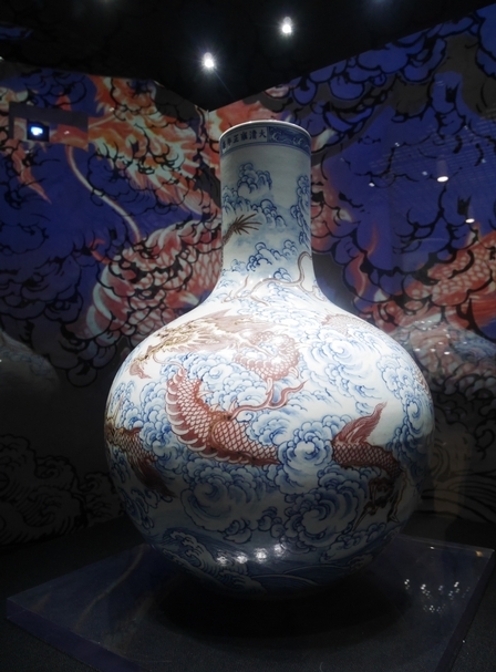 清雍正〈御製青花釉裡紅雲海騰龍大天球瓶〉預展現場。