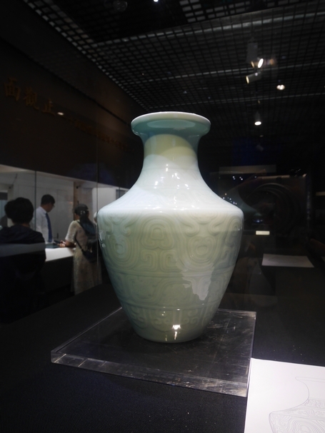 清乾隆〈粉青釉刻仿古夔龍紋罍式大尊〉預展現場。