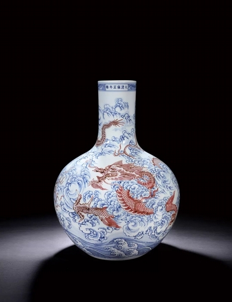 拍前備受注目、北京保利更為其打造環繞螢幕、特殊音效之預展場地的清雍正〈御製青花釉裡紅雲海騰龍大天球瓶〉,於5日深夜23:56起拍,拍前估價待詢,起拍價為人民幣2800萬元,甫一起拍即有多位買家爭相出價,價格攀升極快,到人民幣7700萬元時仍有新買家加入,破人民幣8000萬時仍有四位電話買家出價,後一口50萬出價漸緩,價格於凌晨00:13時突破億元,掌聲雷動,人人叫好。但拍賣尚未結束,價格持續推高,到人民幣1.12億元時,即由北京保利中國古董珍玩部總經理李移舟手上電話買家對上董事趙旭的委託,兩者廝殺,最後歷經近30分鐘的激戰,清雍正〈御製青花釉裡紅雲海騰龍大天球瓶〉以人民幣1.28億元落槌,成交金額為人民幣1.472億元,由趙旭手上的委託搶下,為當日夜場最高價者。
